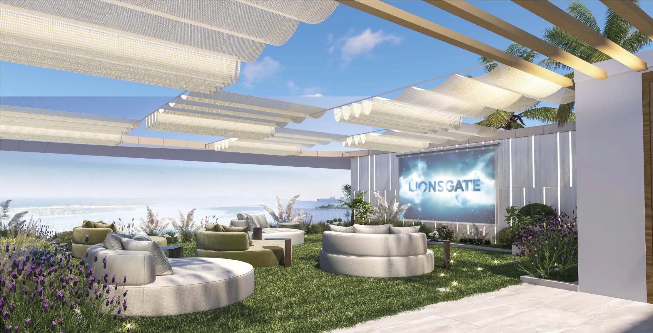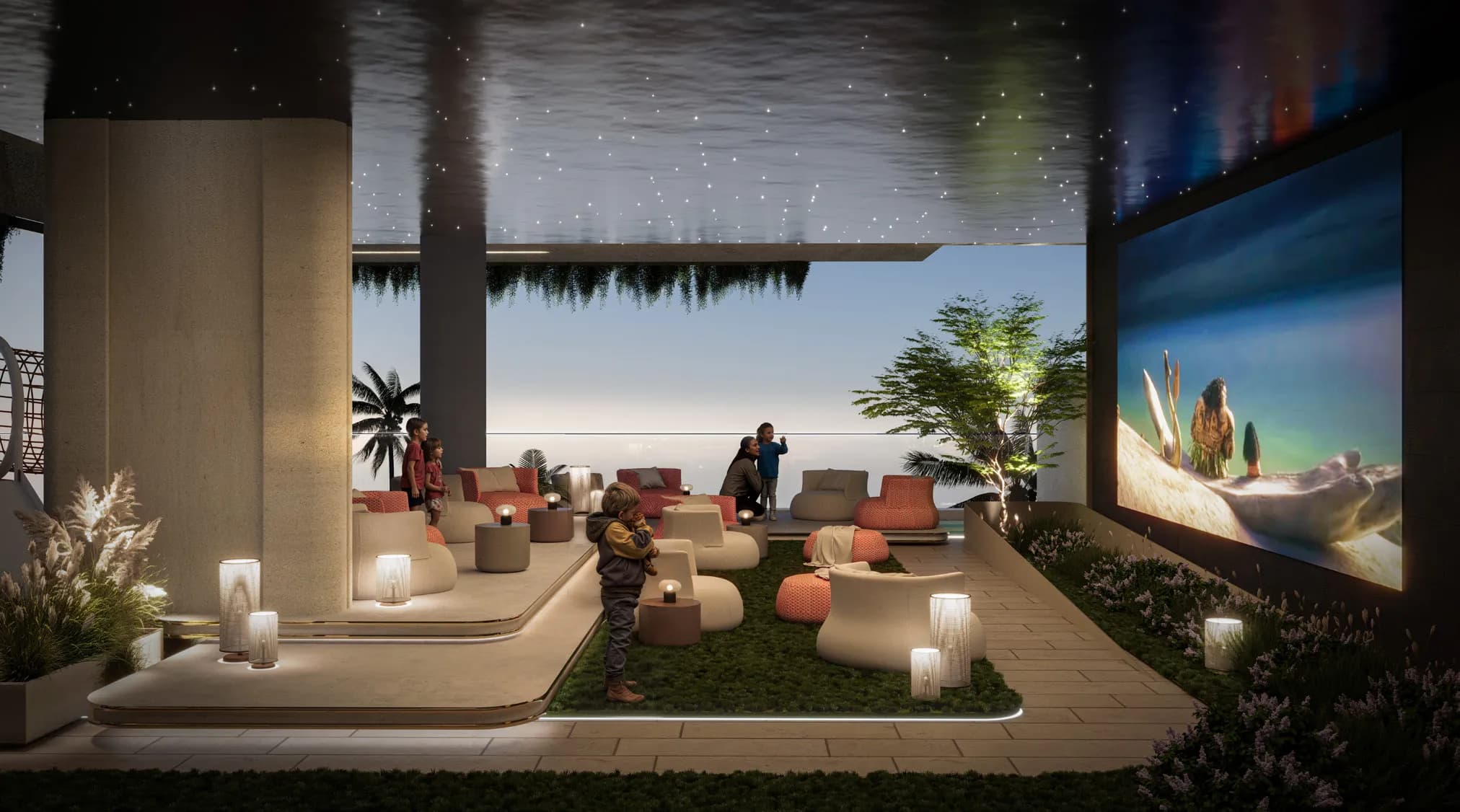 The dual-cinema setup, one enclosed and climate-controlled at podium level, one open-air above, is an unusual detail for a 20-unit building and reflects an amenity-to-unit ratio that would typically belong to a much larger development.