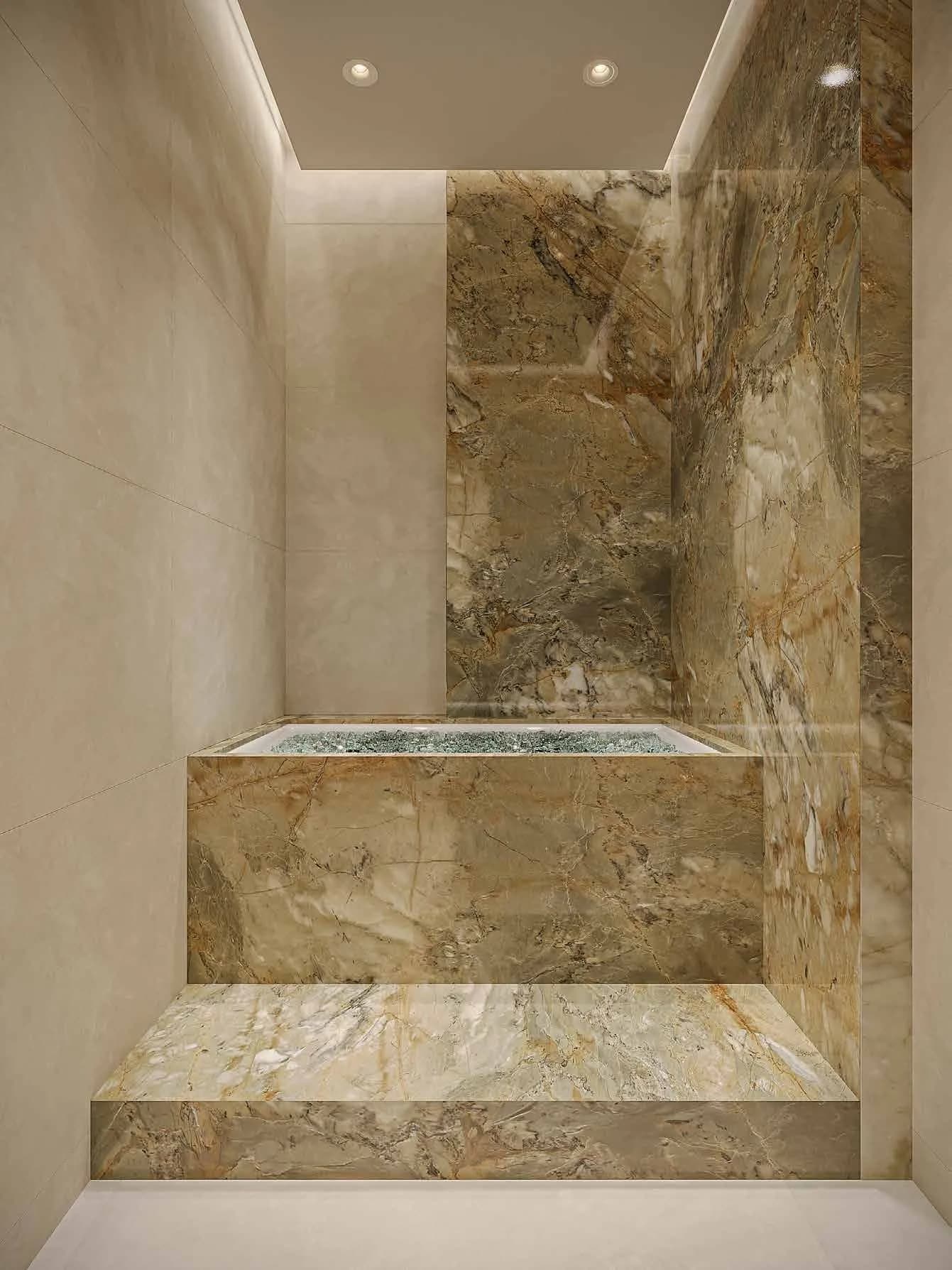 The building's amenity list is broad for a 23-unit development. An infinity pool, gym, yoga space, sauna, cold plunge and co-working space sit alongside more social fixtures: a lounge, a bar area, BBQ stations and garden terraces.