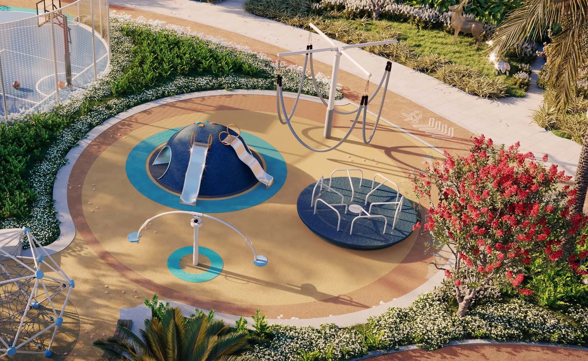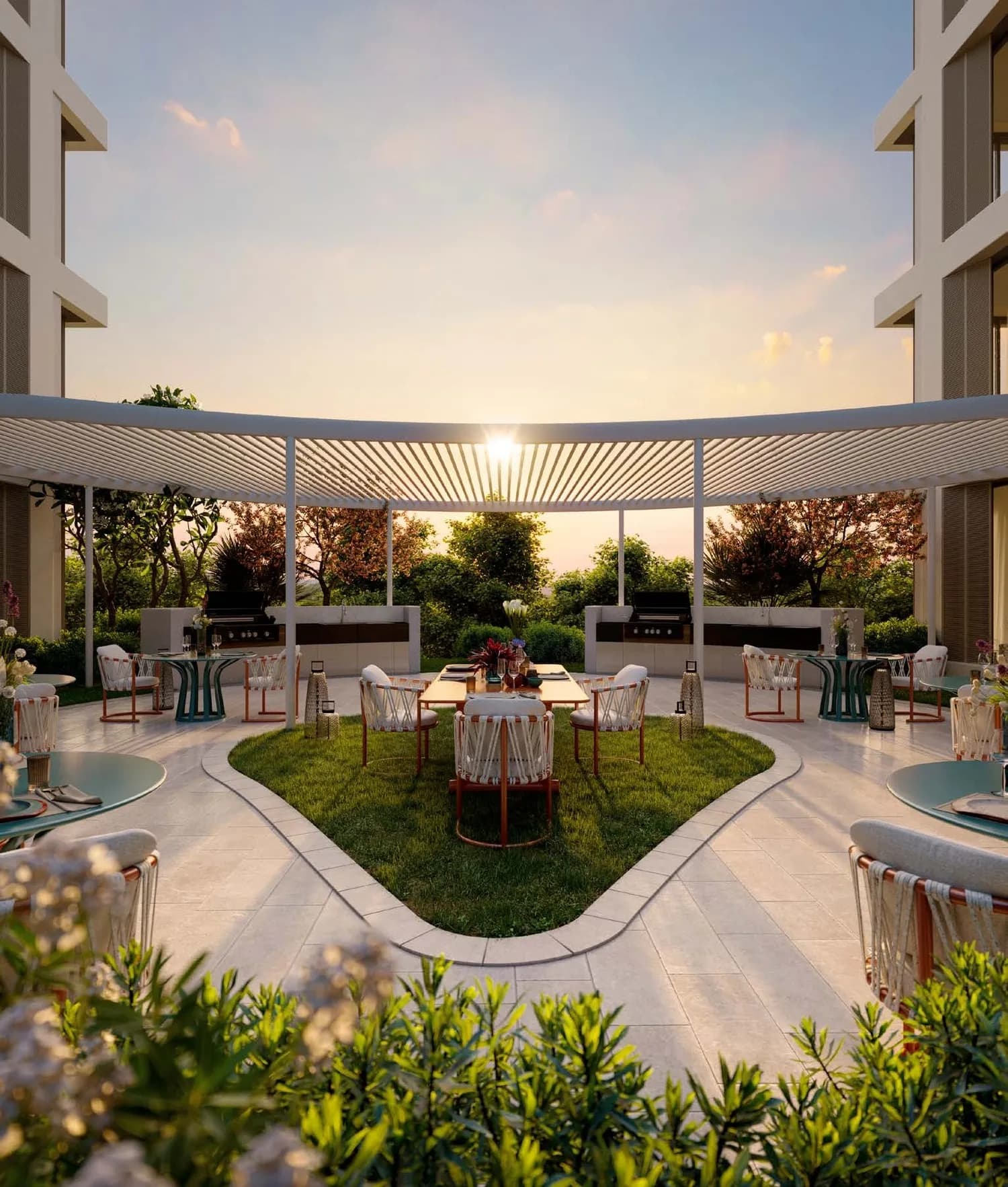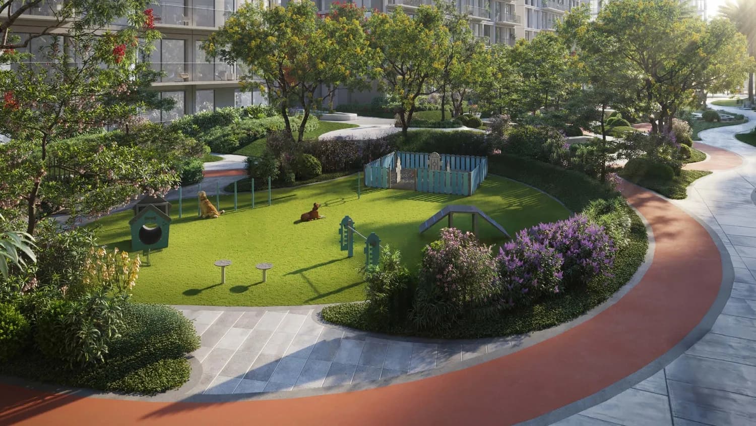The development's communal offering is structured around both fitness and social use. On the active side, residents have access to an adult pool, a kids' pool, an outdoor gym, a jogging track with walkway lawn, and a dedicated sports zone. A dog park is also included, which remains an uncommon provision in this price bracket.