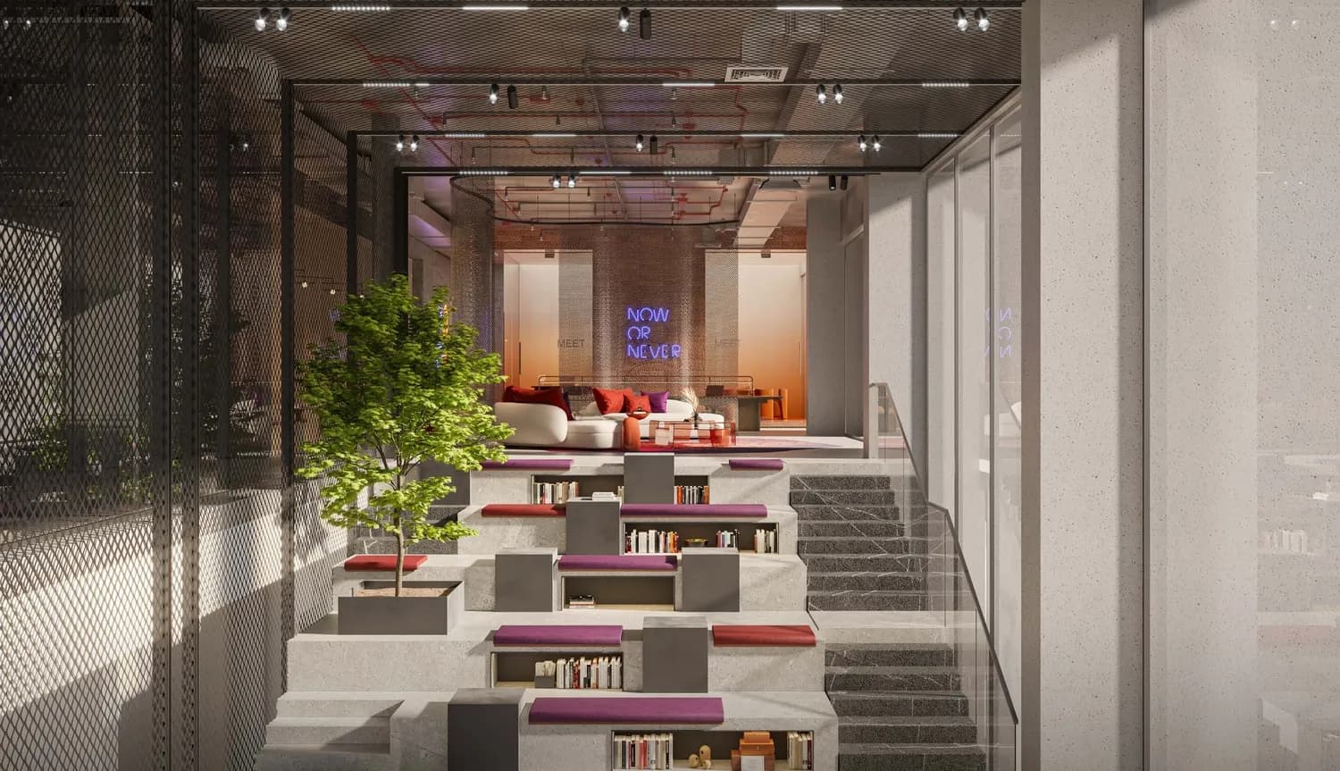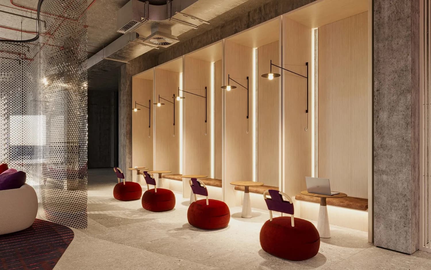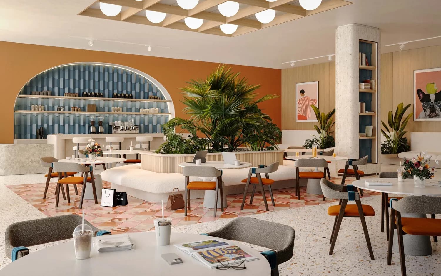 The social and productive spaces are equally considered. A co-working area, study and library, coffee shop, BBQ area, amphitheatre and pocket seating zones collectively cover the range from quiet focused work to informal gathering. A kids' play area rounds out the family-oriented provision.