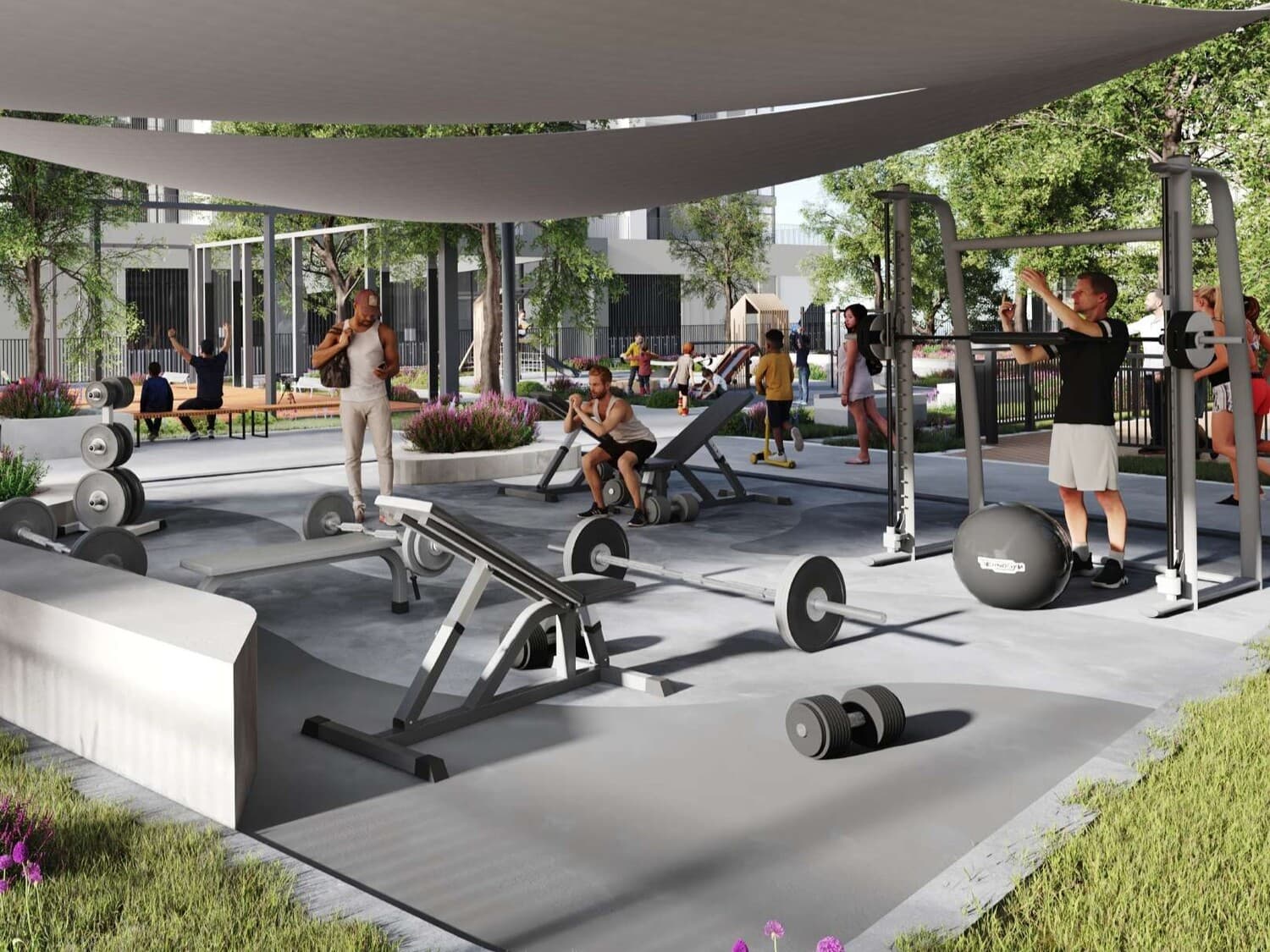 The amenity list covers the practical and the wellness-focused in equal measure. An indoor gymnasium and an outdoor gymnasium run alongside a sauna and a dedicated yoga zone. The pool offering splits into adult and children's pools, with additional kids' play areas for families. A multipurpose room rounds out the shared facilities.