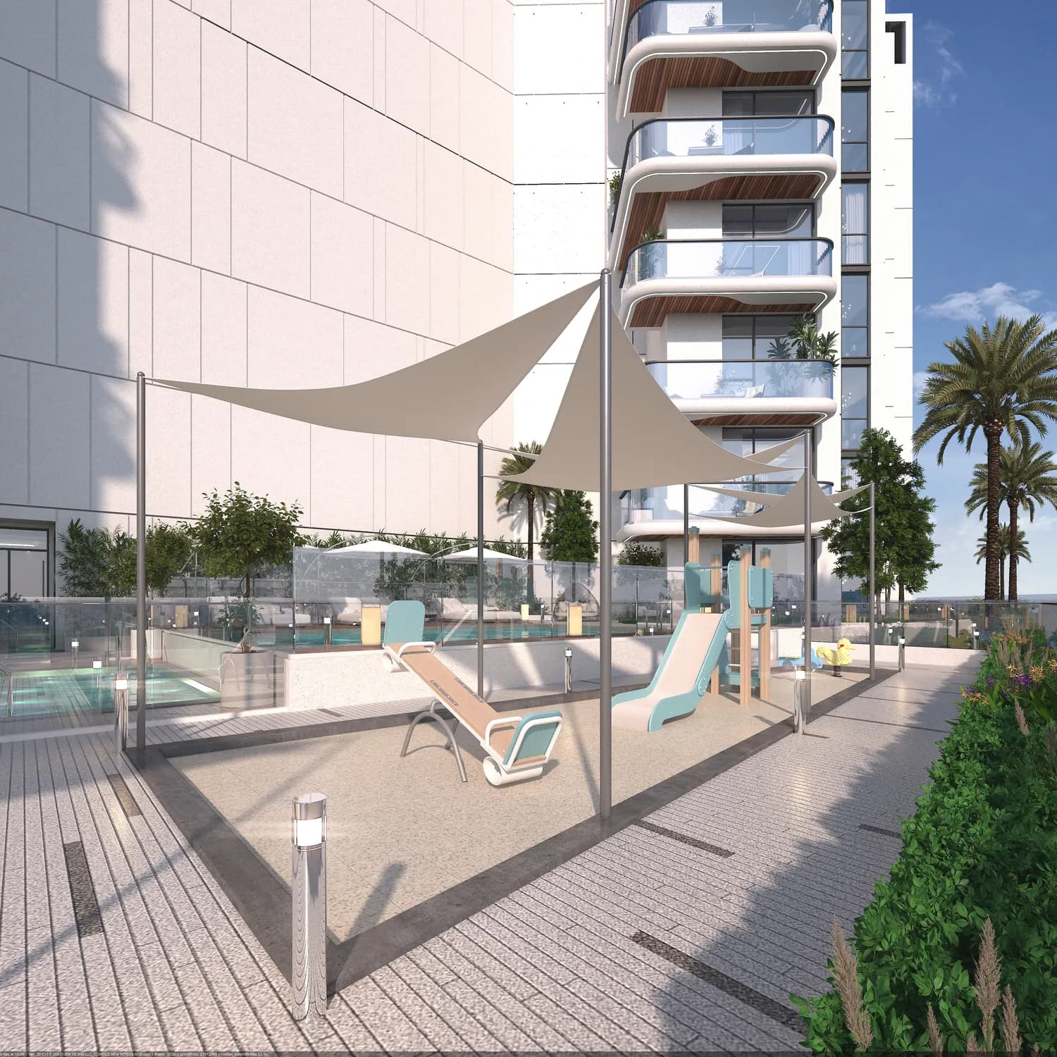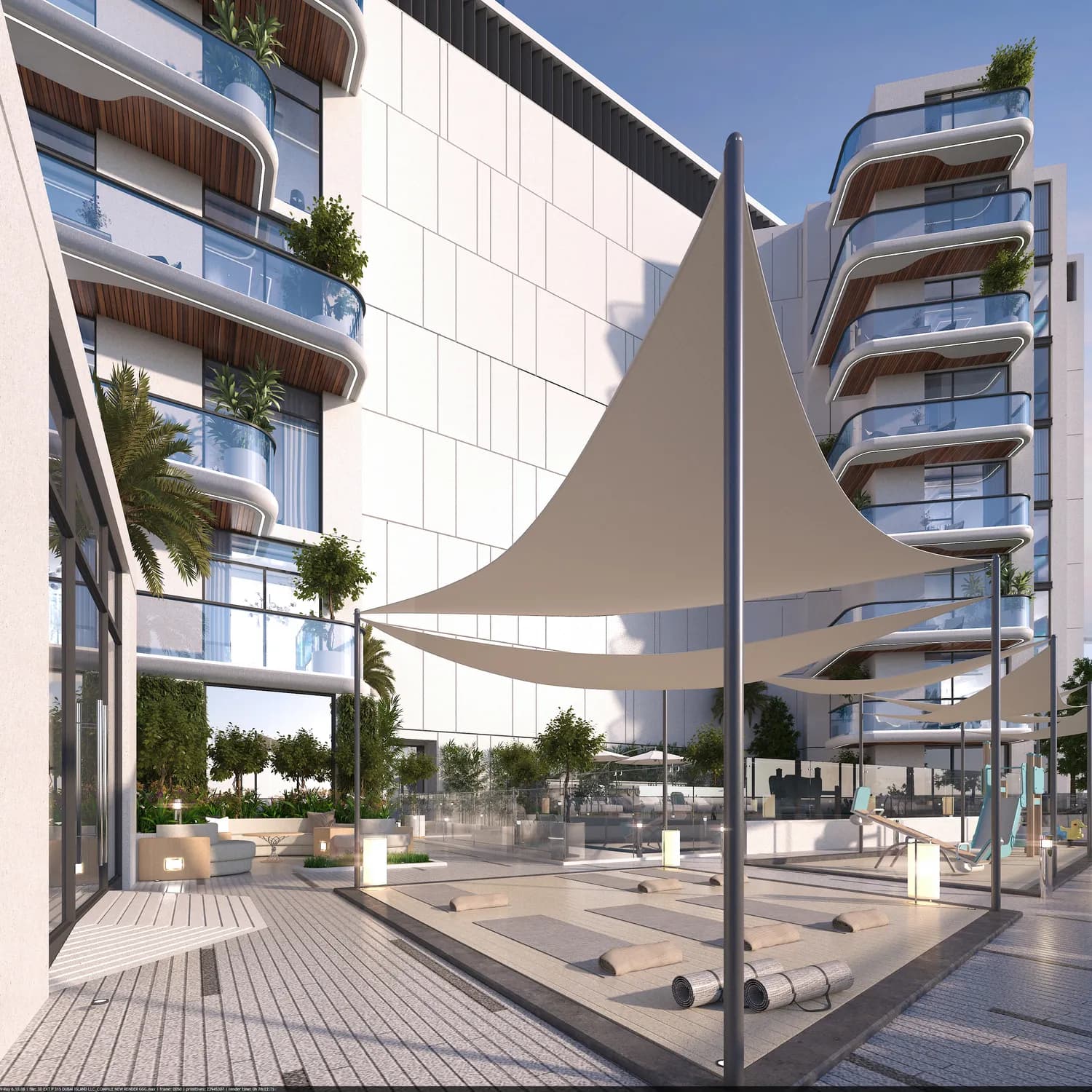 The building's amenity list is concise and practical. A main swimming pool is supported by a separate children's pool and a kids' play area. A gym and outdoor yoga studio address fitness. A cryosauna distinguishes the wellness offer from the standard Dubai apartment package. Communal outdoor space includes a lounge area and a barbecue zone, both of which suit the island lifestyle the location implies.