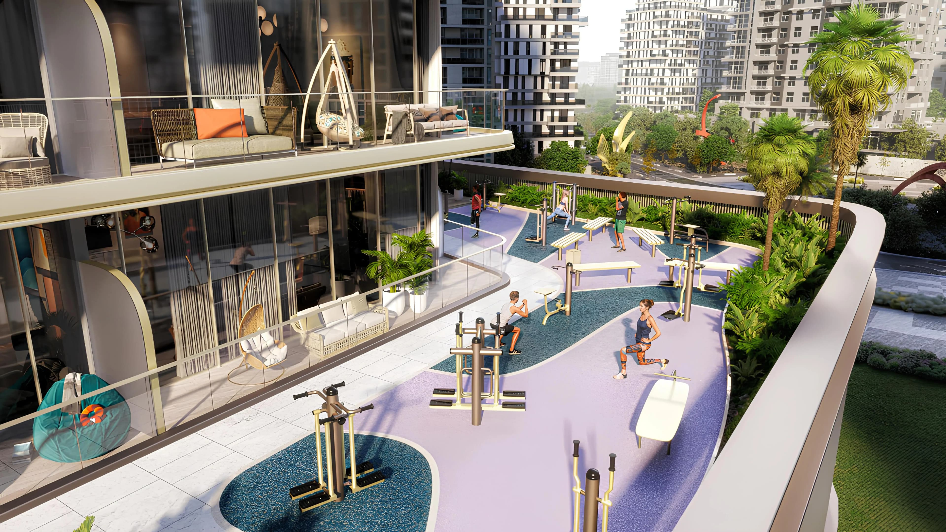 The architecture follows a contemporary idiom, with clean vertical lines and an orientation that the developer notes offers open views across the surrounding district. DLRC itself remains a developing neighbourhood, and buyers should factor in the construction activity typical of the corridor when assessing the immediate surroundings.