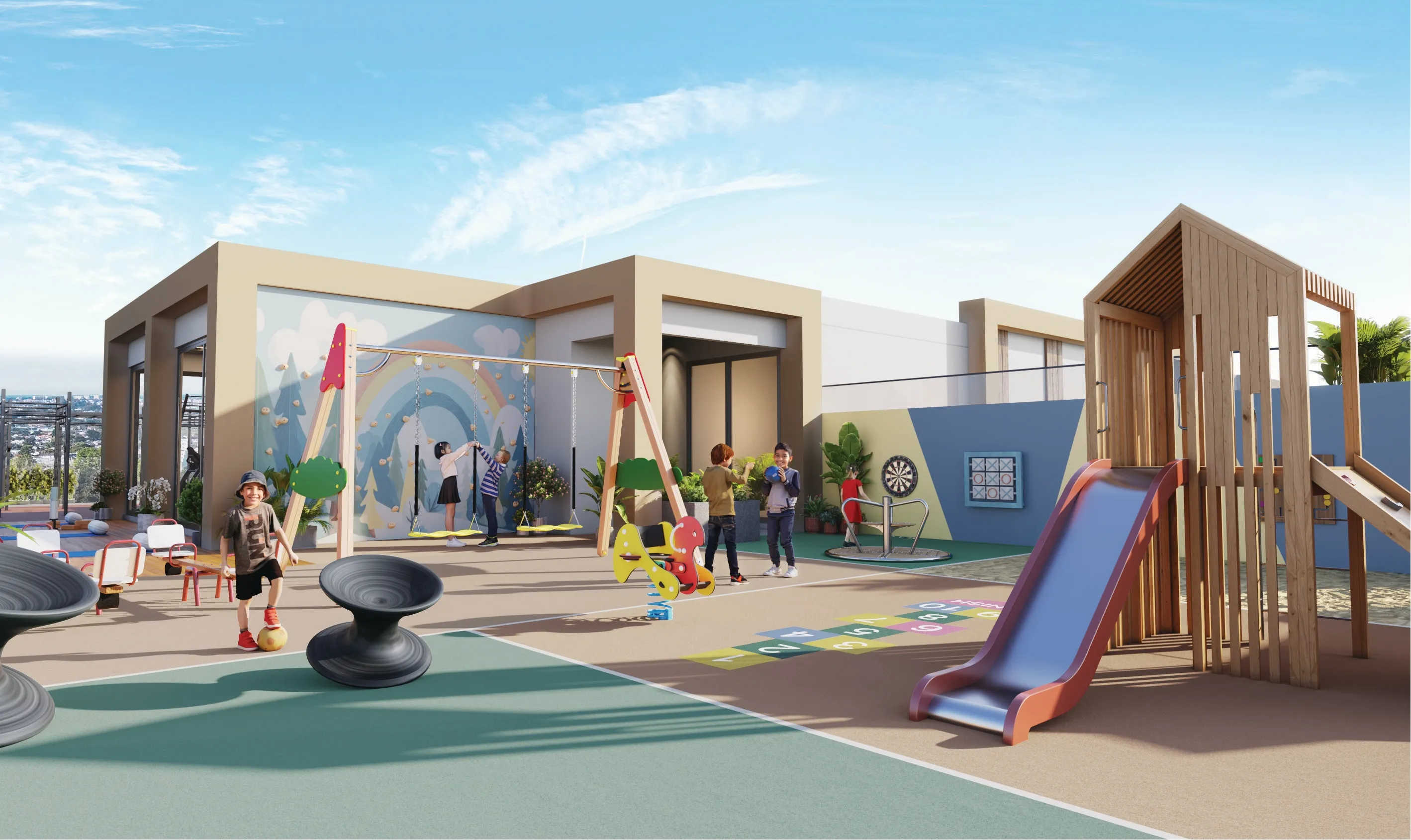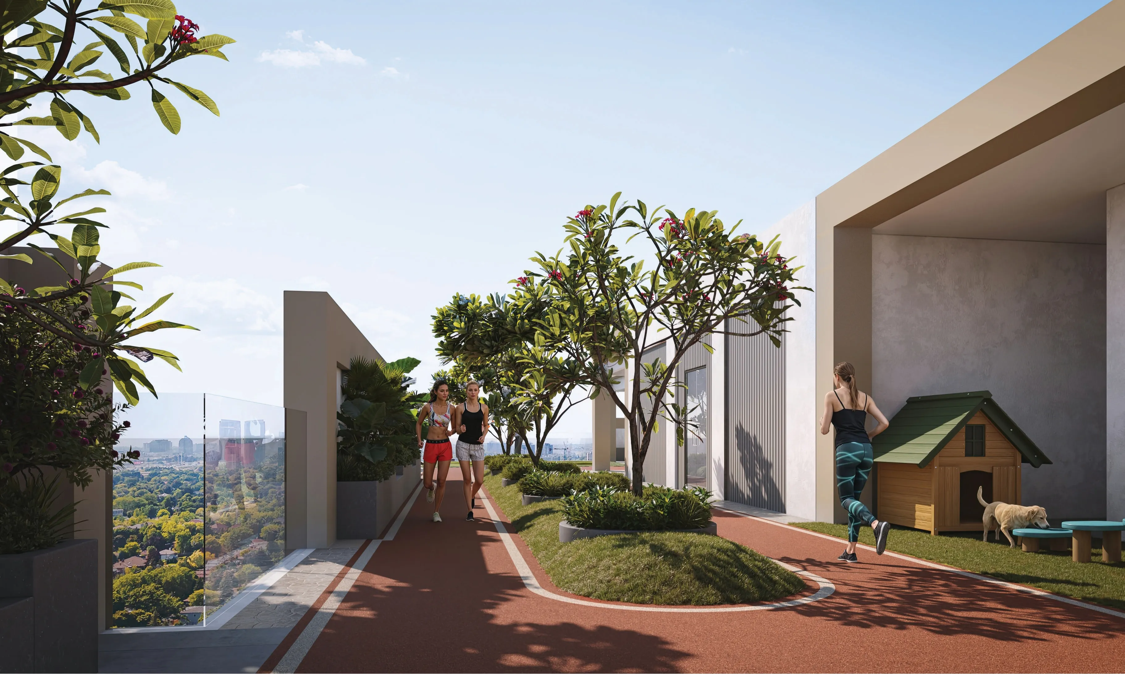The facilities list is broader than the building's boutique scale might suggest. An infinity pool and private cabanas sit alongside a yoga area, fitness studio, and jogging track. For families, there is a dedicated children's play area and a pet corner on the jogging circuit. The open-air theatre, BBQ area, and rock climbing wall extend the range of communal programming.