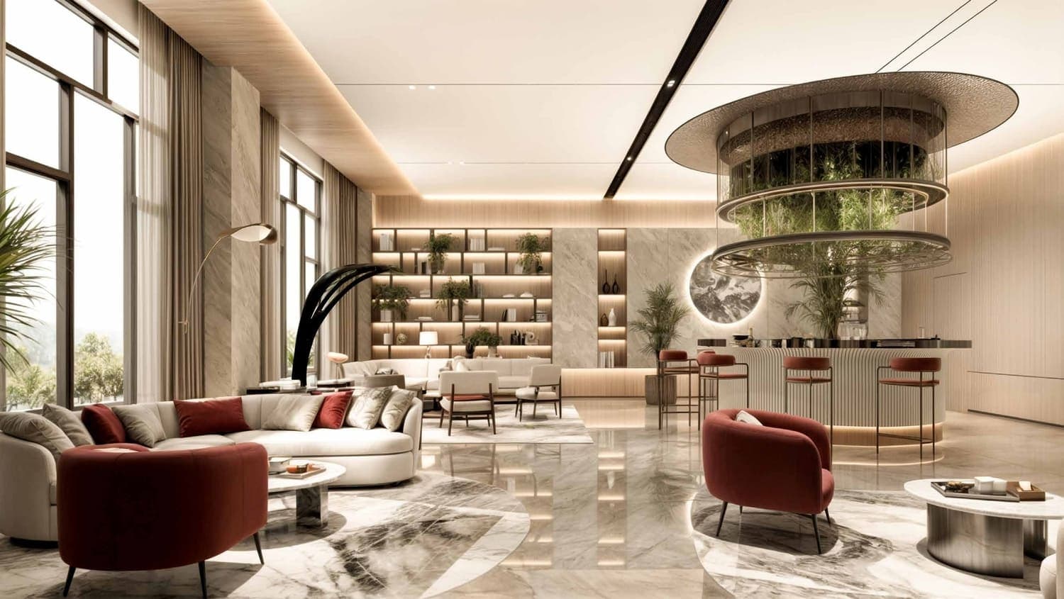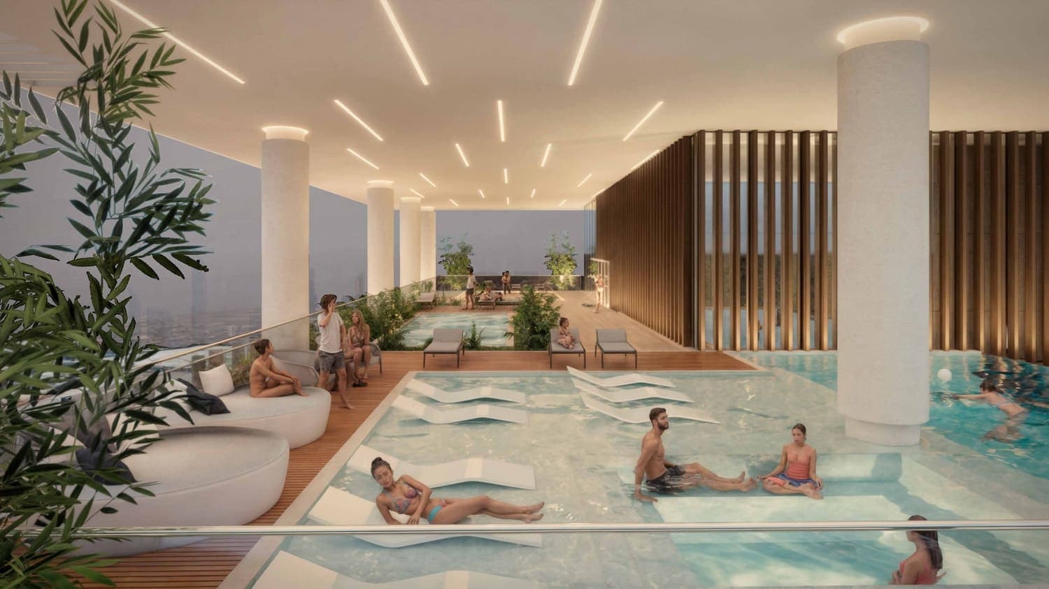 The rooftop infinity pool anchors what appears to be the building's primary communal zone, pairing the pool with the broader wellness and social infrastructure. A business lounge adds practical value for residents who work from home or travel frequently and need a professional setting without leaving the building.