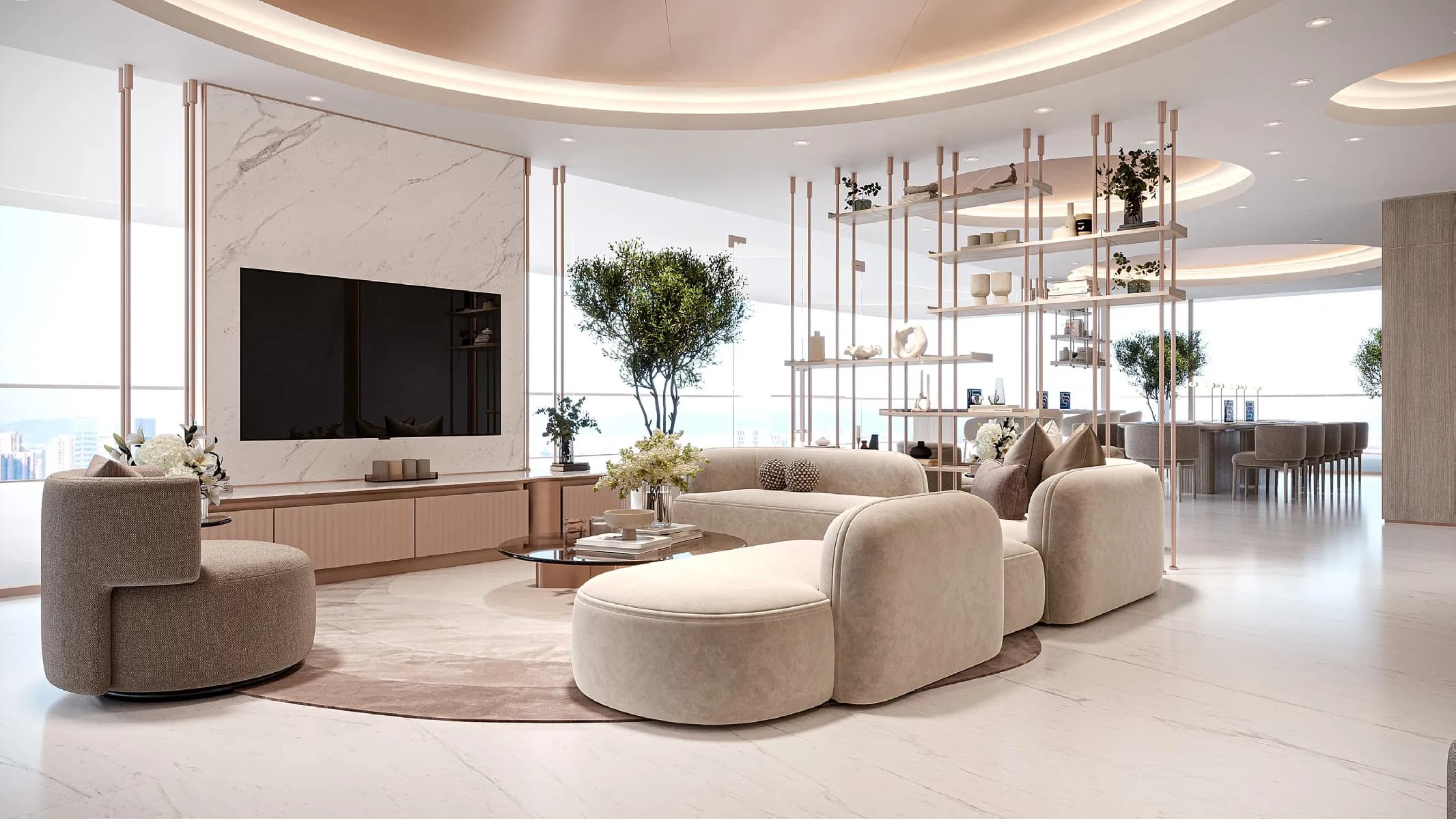 All apartments come fully furnished. Specified brands include Bosch for appliances, Laufen for bathrooms, Bose for audio, and UniFi for networking infrastructure. The interior material language runs to stone surfaces, timber detailing and warm lighting rather than the high-gloss finishes common across much of Dubai's mid-market supply. Service charges are set at AED 15 per sq ft annually.