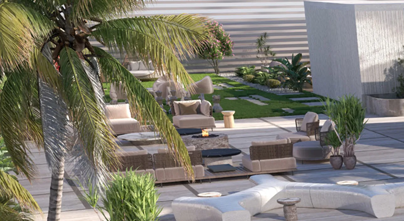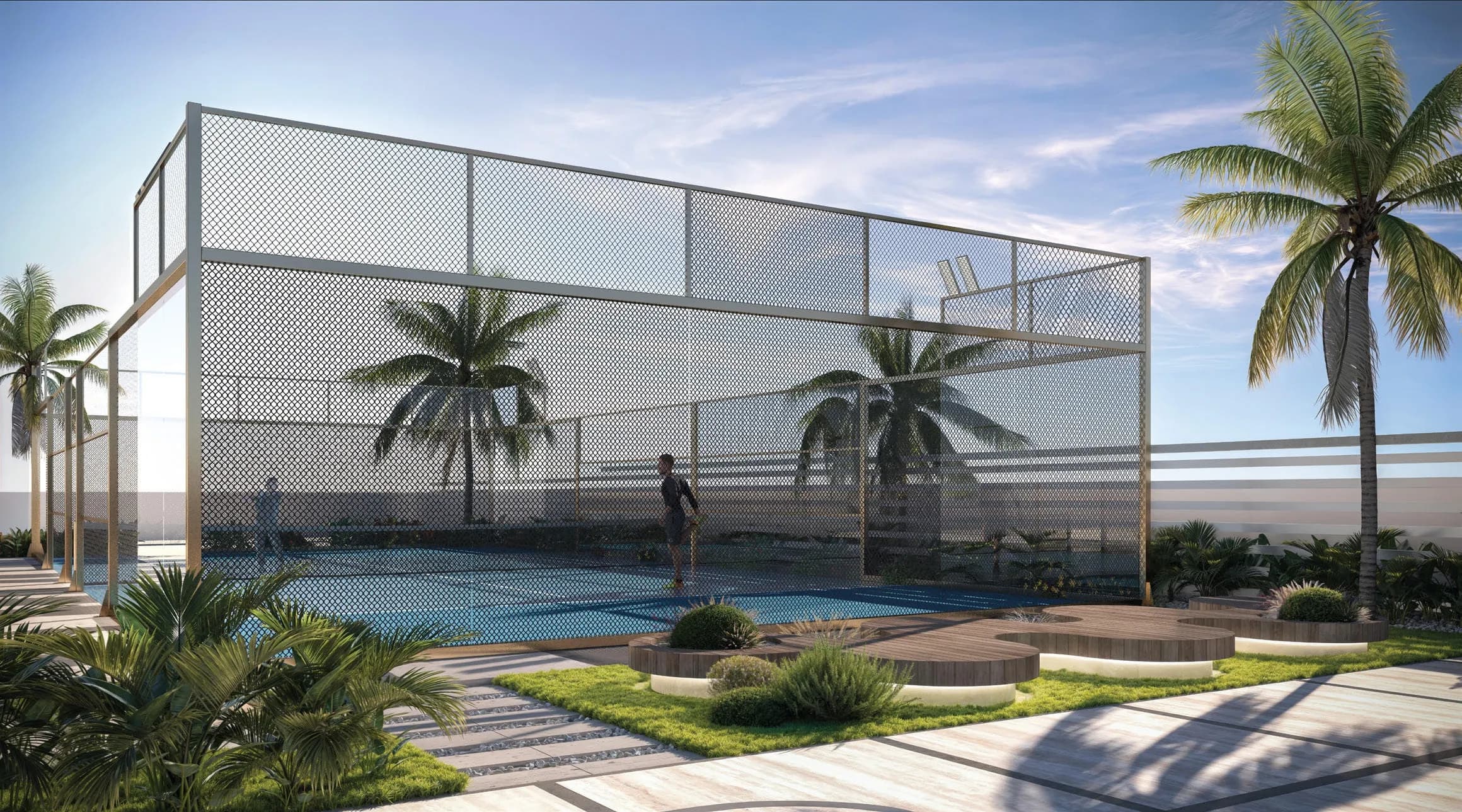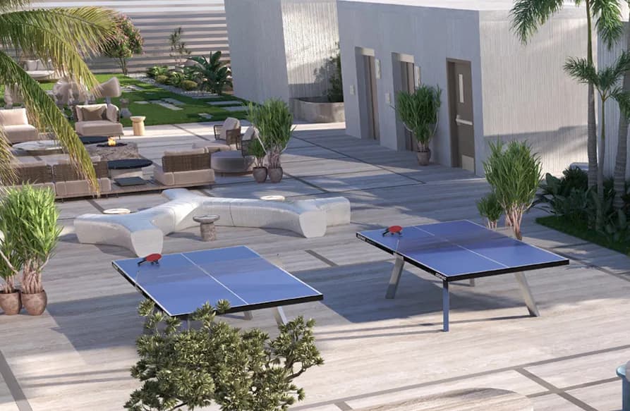 The amenity programme divides across rooftop and ground-level spaces. On the roof, residents have access to an outdoor cinema, padel court, cabanas, lounge areas, a BBQ zone, table tennis and a chess corner. The programming is sociable rather than purely restorative, which suits a building likely to attract younger owner-occupiers and short-term rental operators.