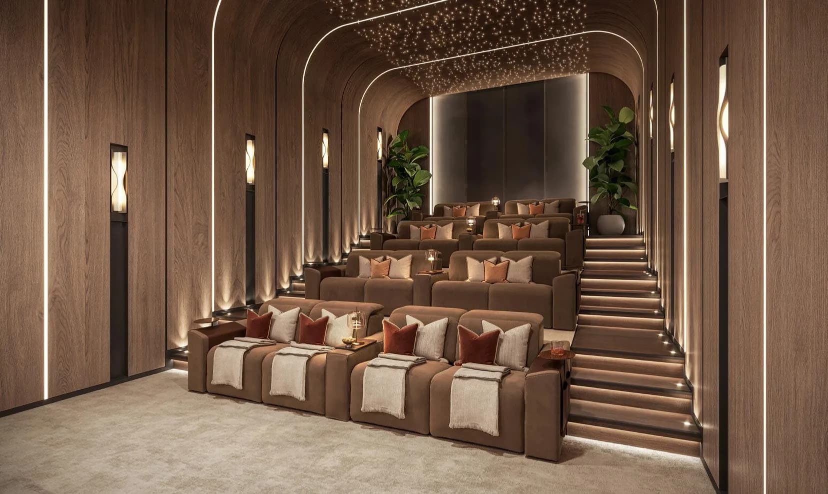 For a project of 28 units, the amenity list is substantial. The clubhouse spans a pool deck with a family pool and sun lounger areas, a lounge bar, games room, cinema room, podcast room, co-working space and a padel court. Wellness provision includes a fitness studio and spa.