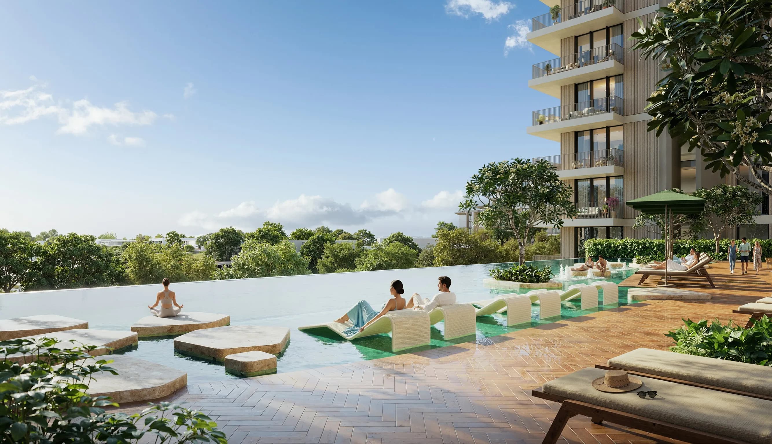 The programme reads more like a managed resort neighbourhood than a standalone residential tower, which is consistent with what Expo City Development has built into the master plan since the site's transformation post-2021.