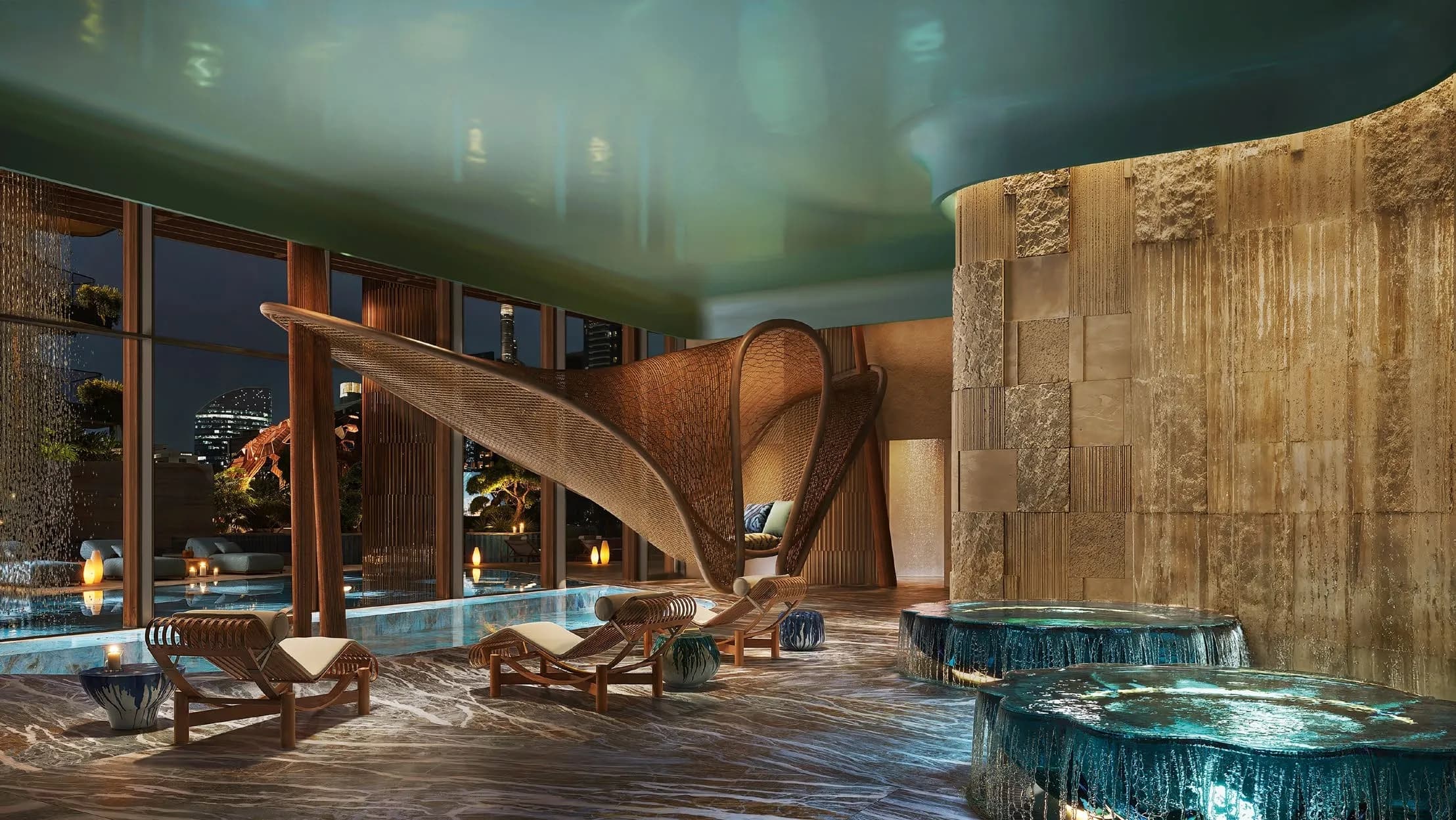The amenity programme is extensive for a building of 27 homes. Six pools are distributed across the project, including an infinity pool with a pool deck, an indoor pool, and a feature called the Tulkun Lounge Pool. For a tower of this size, that ratio is exceptional.