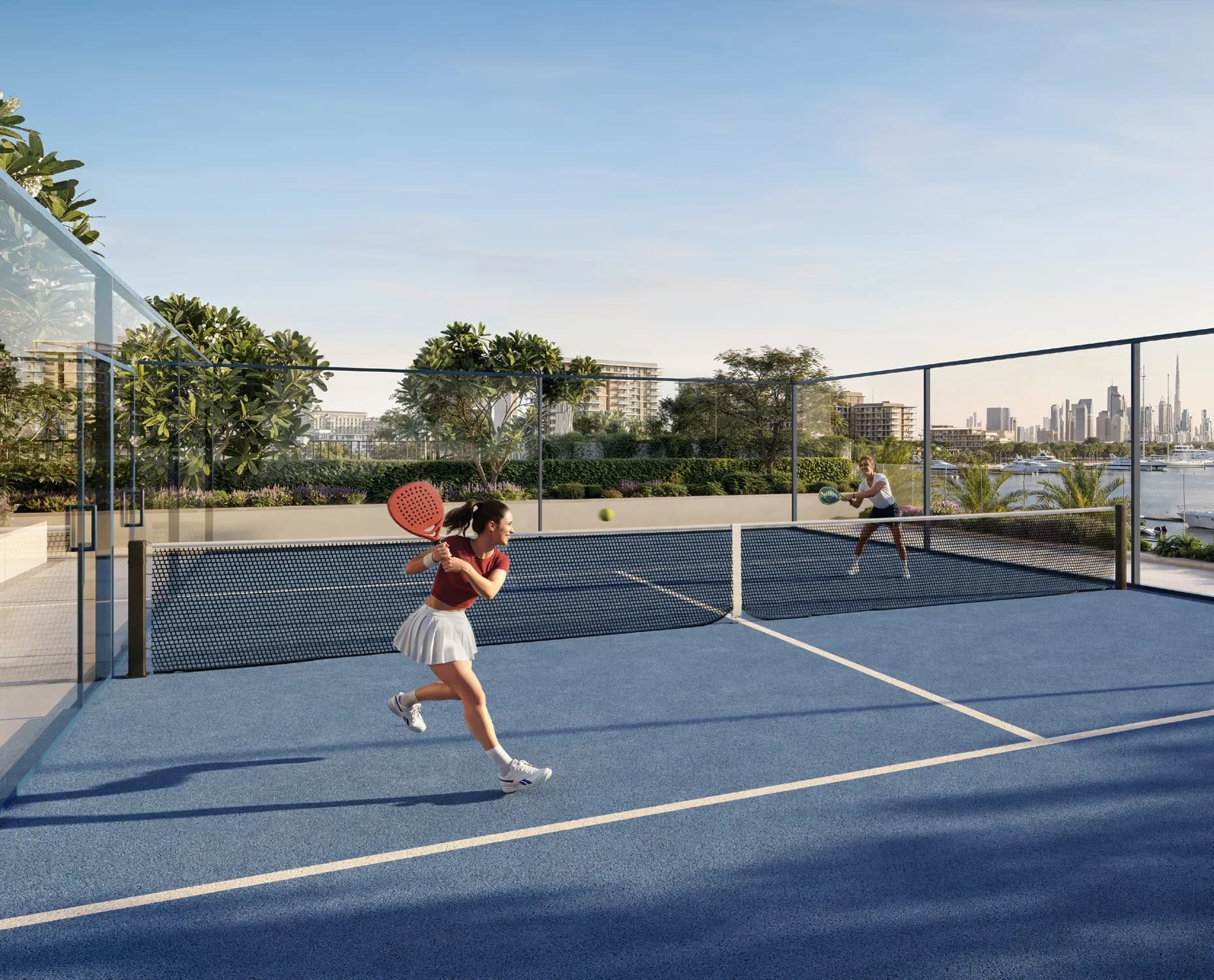 The amenity list covers a broad range of uses without the kind of resort-scale excess that can drive service charges to uncomfortable levels. An infinity pool and a separate kids' pool with splash zone address different household types. A padel court, gym and yoga area handle fitness. BBQ and events areas provide social infrastructure.