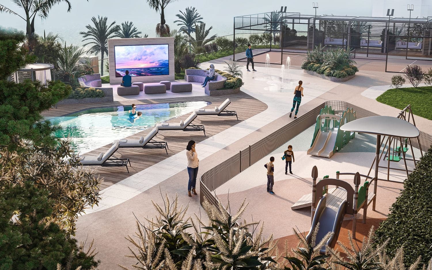 Families are accommodated through a dedicated kids' play area and a separate outdoor play area. The building also lists shopping malls and restaurants among its amenities, which in this context likely refers to proximity to commercial facilities within Dubai Islands rather than on-site retail.