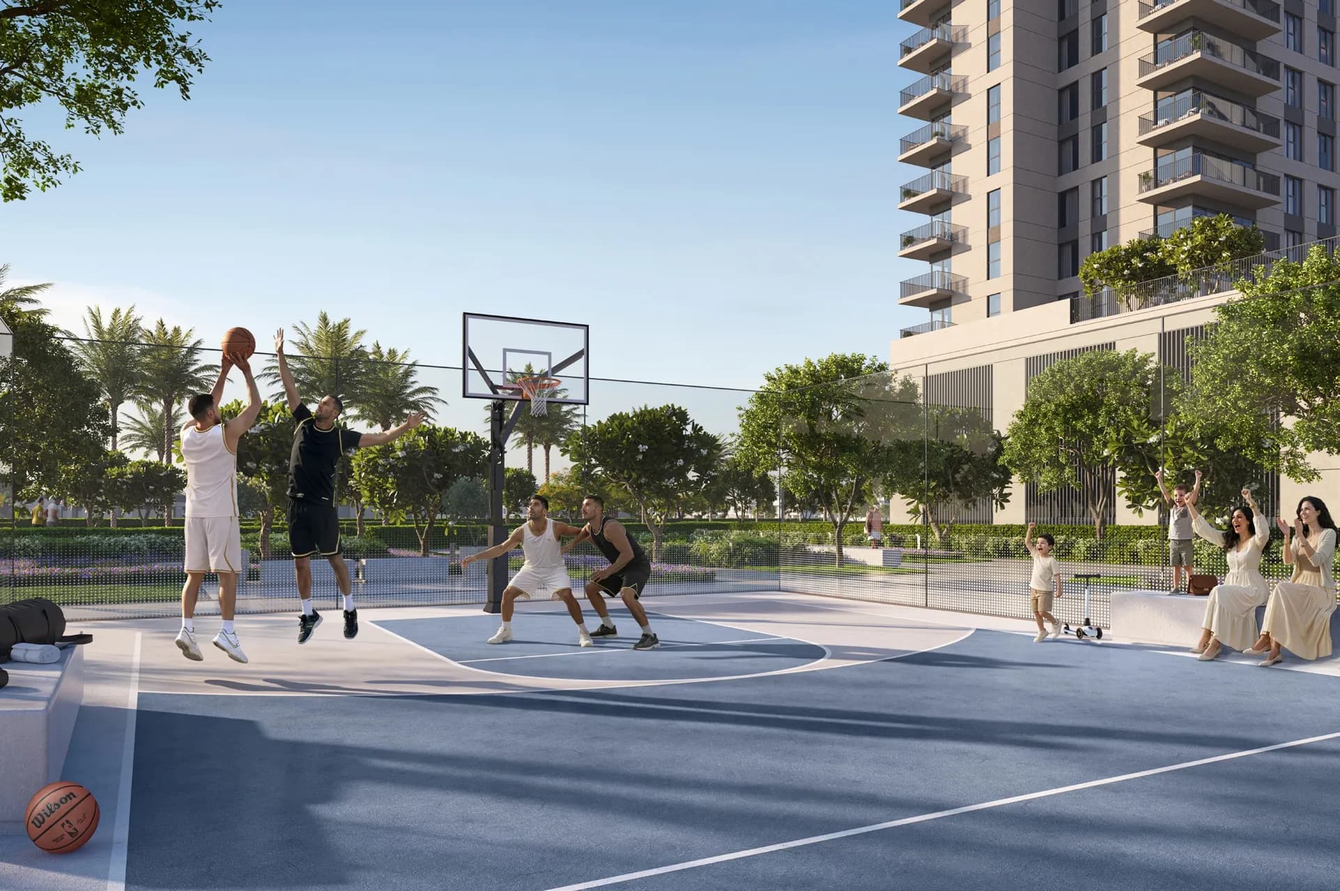 The building's residents access an infinity pool, gym, indoor and outdoor yoga areas, a sport court and a basketball court. A BBQ area and kids' play area round out the communal offering. These are standard provisions for an Emaar mid-tier building, functional and well-maintained by the developer's operational track record, if not elaborate.