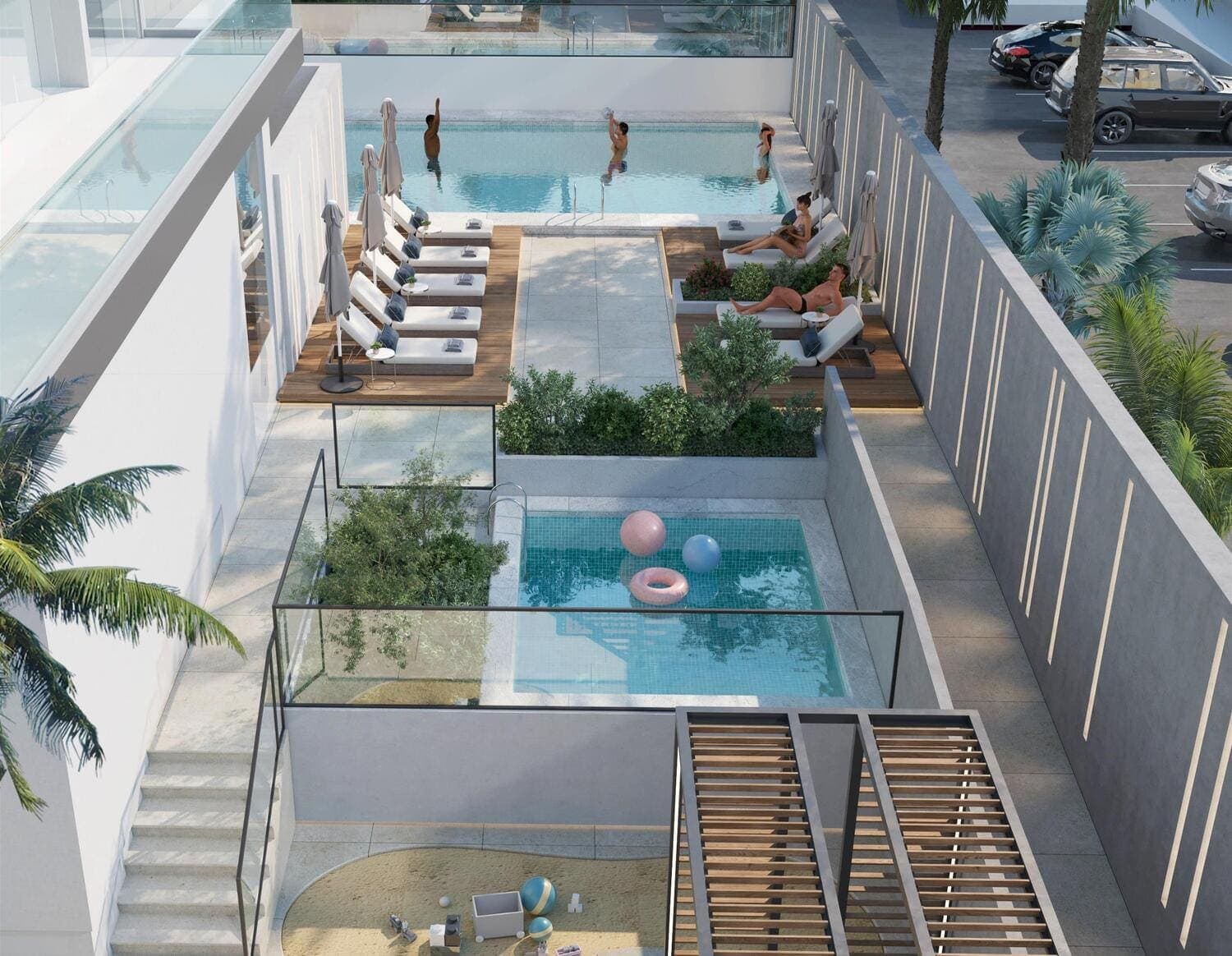 London Gate has allocated considerable communal space to leisure and wellness programming. The amenities list covers a Serenity Pool, a Wellness Hub, a Fitness Centre, a Sunken Lounge, a Vista Lounge and a BBQ Courtyard. Family provision runs to a Kids Play Area, a Kids Splash Zone and a Leisure Zone. An Outdoor Cinema completes the offering.