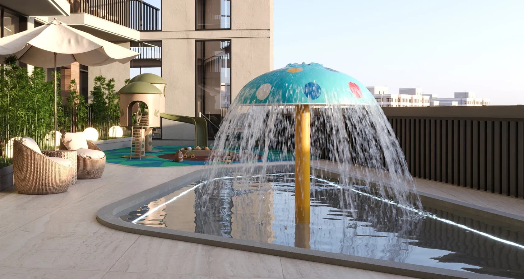The leisure offer is built around water. A main swimming pool, a jacuzzi, a kids' pool, and a splash area occupy a meaningful portion of the podium deck, giving the building a resort-adjacent quality without overstating it.