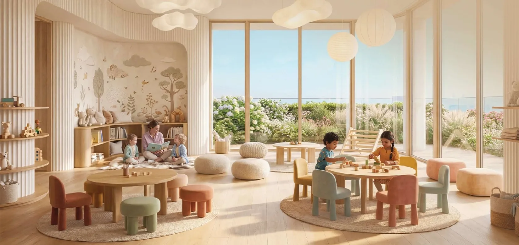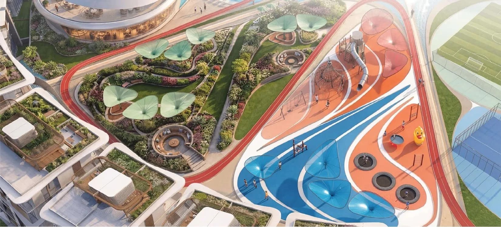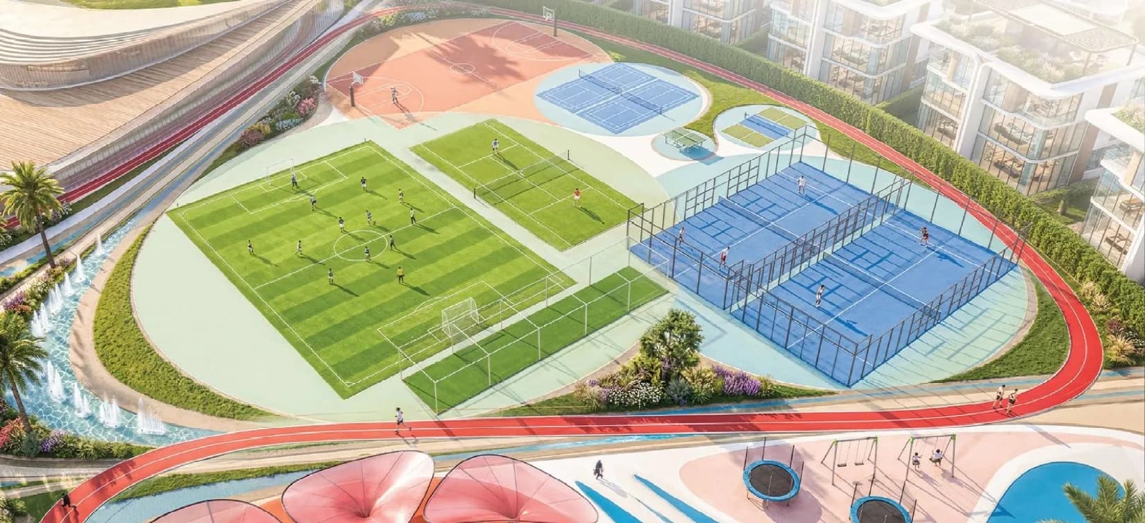 Multi-sport courts, a jogging track, wellness and sports zones, a panoramic gym and a kids' aqua park sit alongside a conventional swimming pool. A dedicated kids' day care facility is included, which signals a clear orientation towards families with young children rather than a purely investment-driven buyer profile.