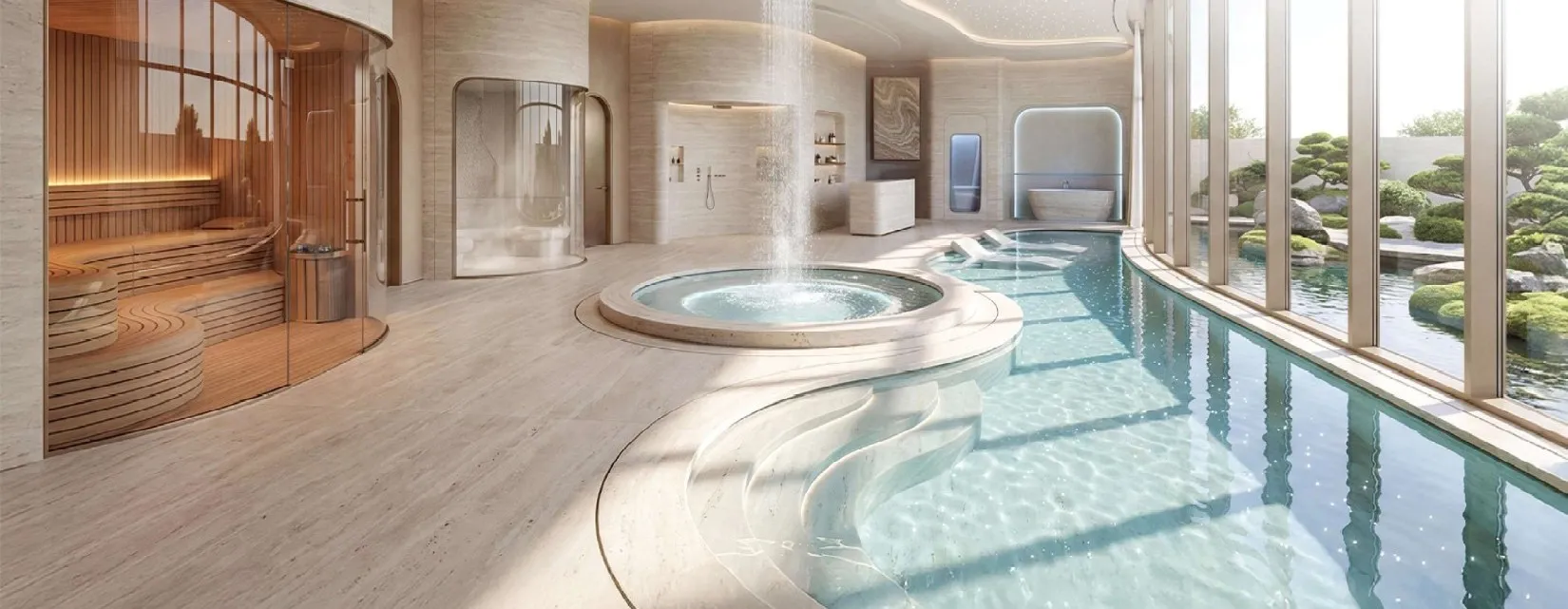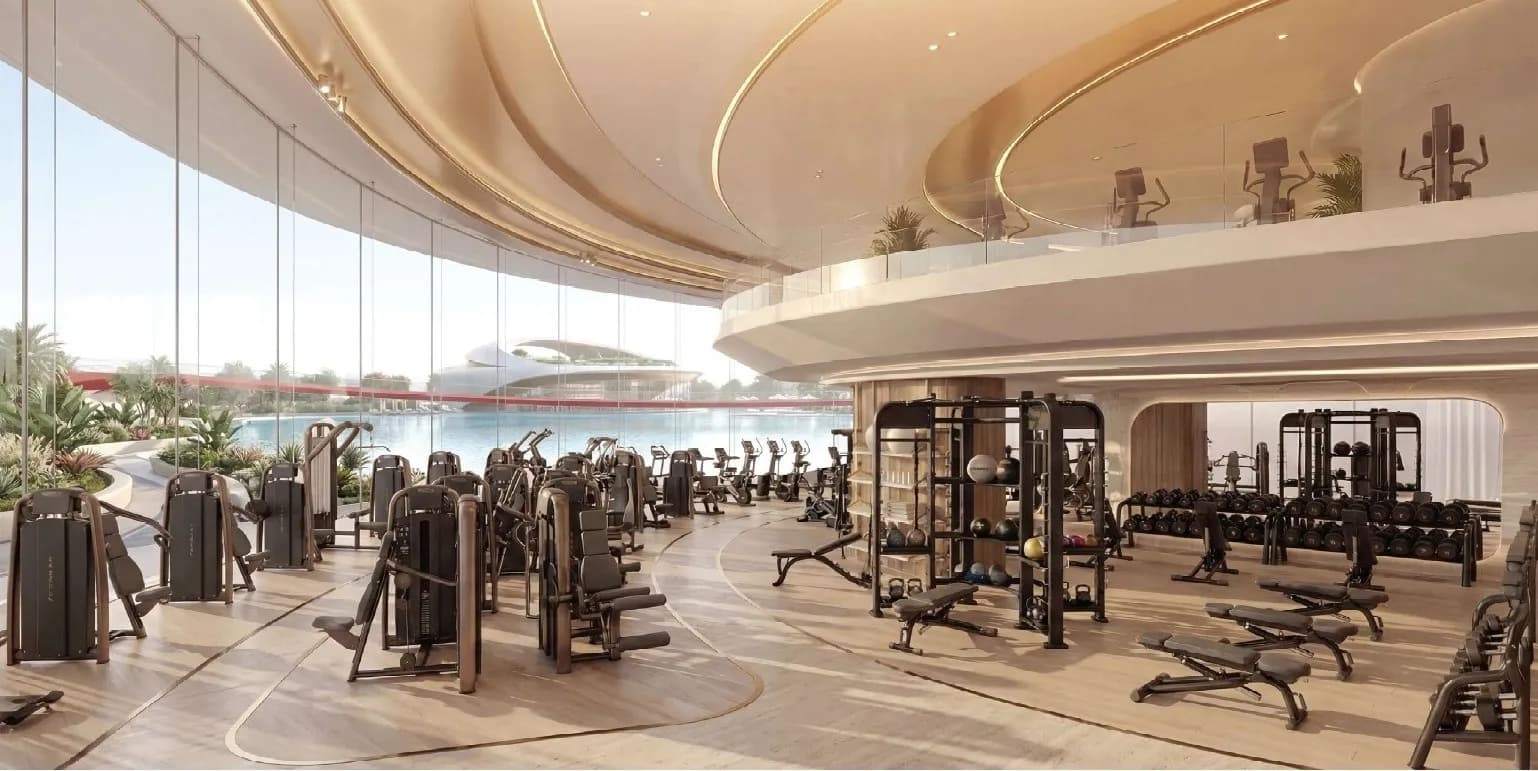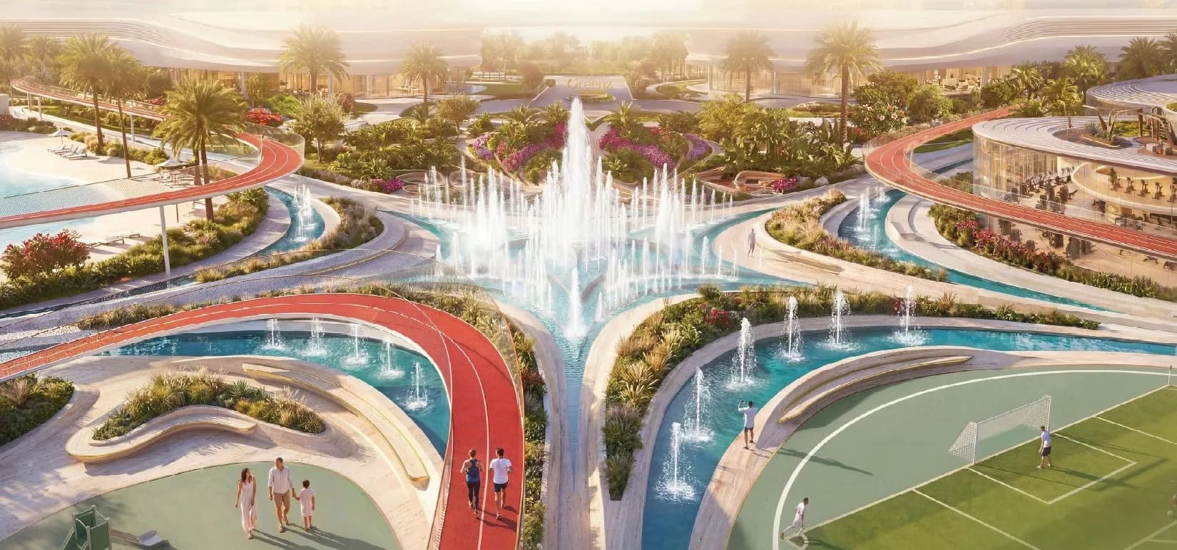 Spa rooms, a sauna, a masjid, retail outlets and what the developer calls "green zen spaces" complete the picture. The dancing fountain is a deliberate aesthetic gesture, common in Dubai developments targeting a certain lifestyle register. Whether it reads as a welcome amenity or a superfluous addition depends entirely on the buyer.