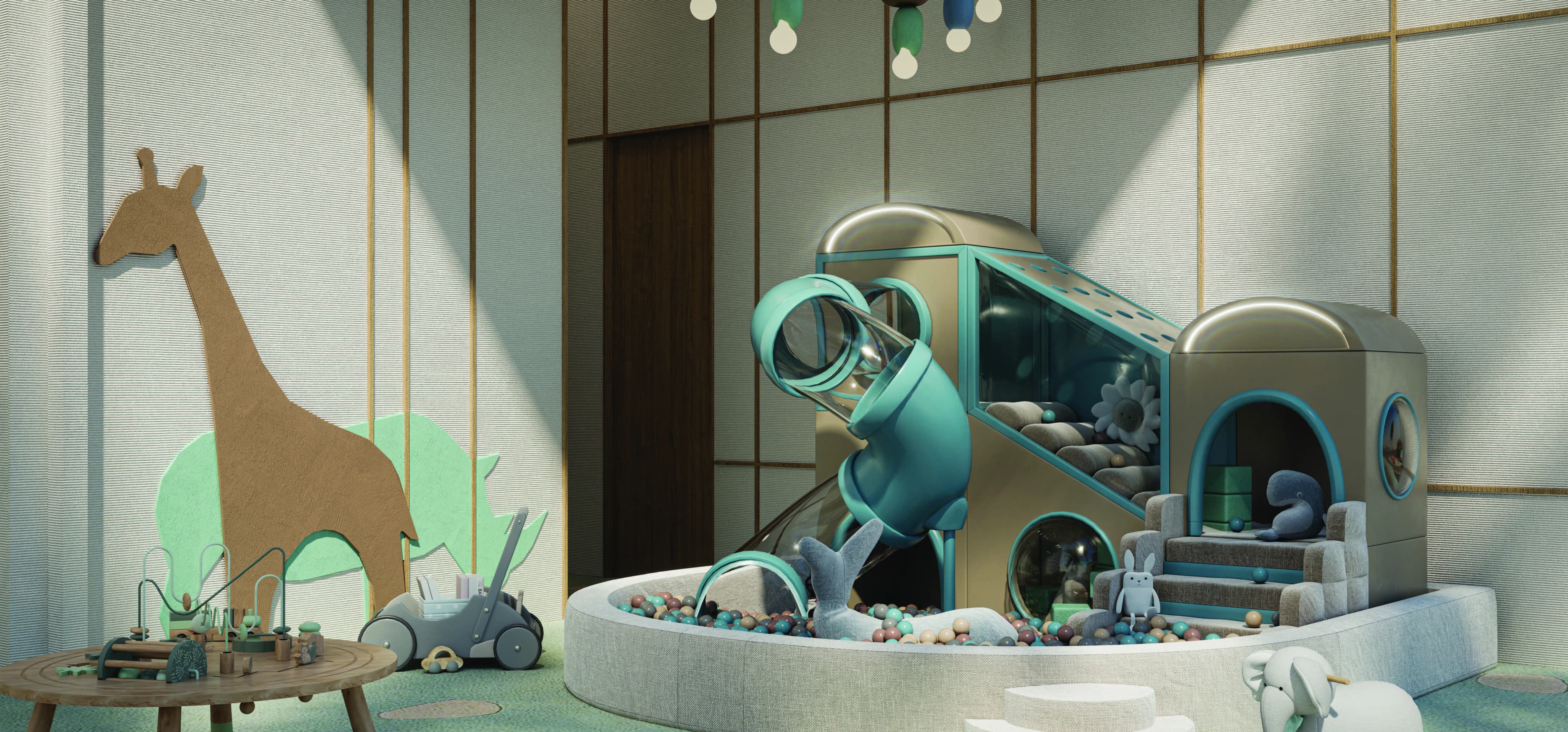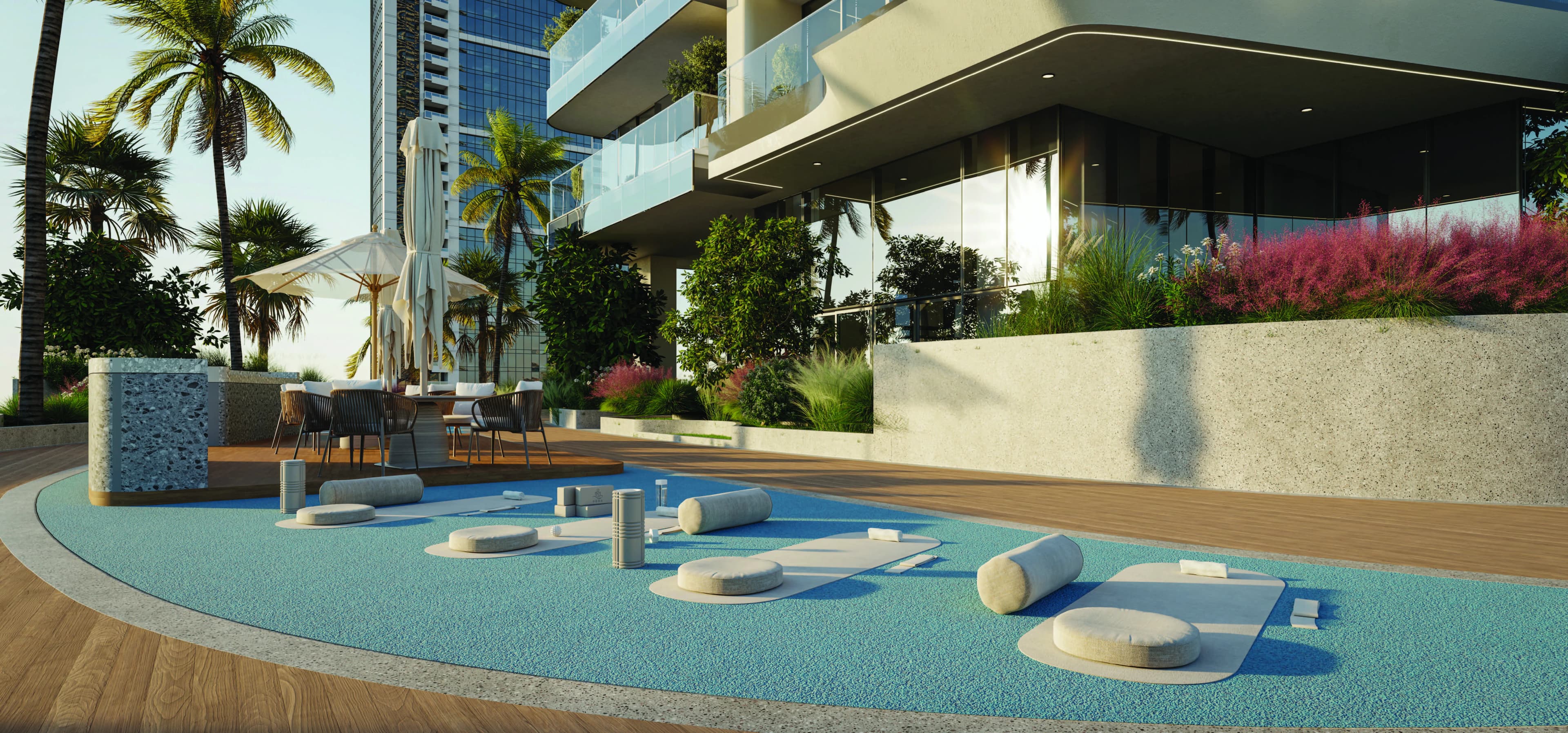 Wellness is addressed through a dedicated wellness pavilion and an outdoor yoga area. The open-air fitness deck extends exercise options beyond a conventional gym. For families, both an indoor and outdoor children's play area are included. Social infrastructure covers a lounge, celebration hall and a cozy fireplace area, the last of these an unusual specification in Dubai's climate, presumably intended for the cooler months between November and February.