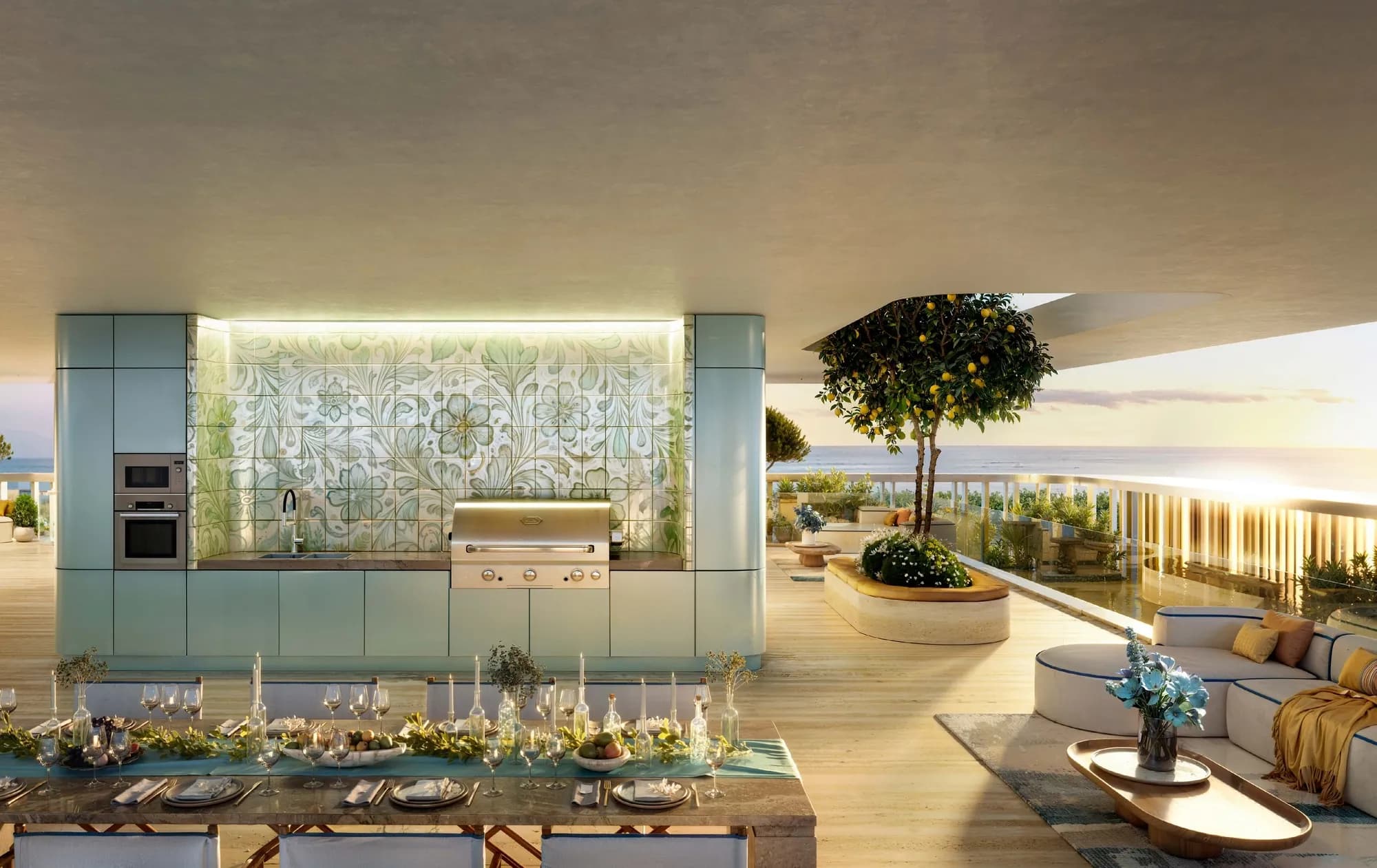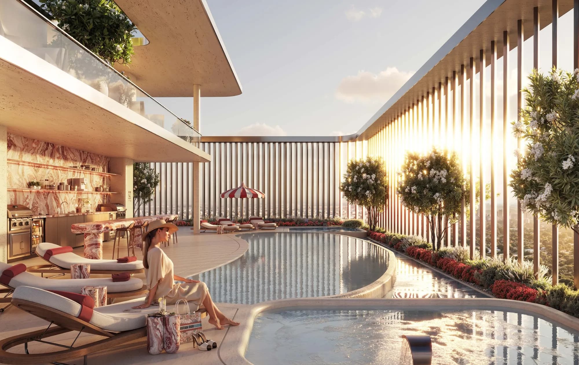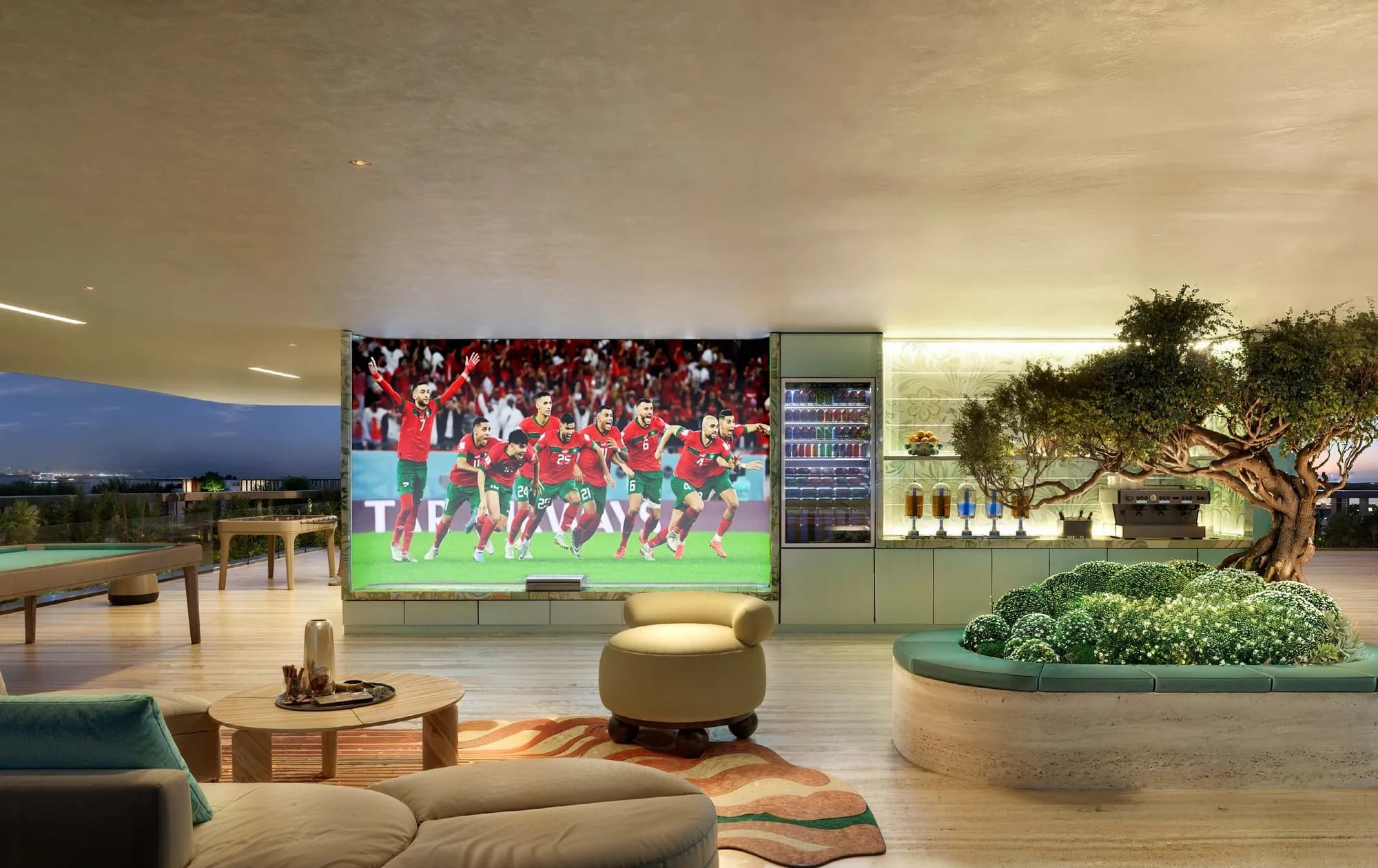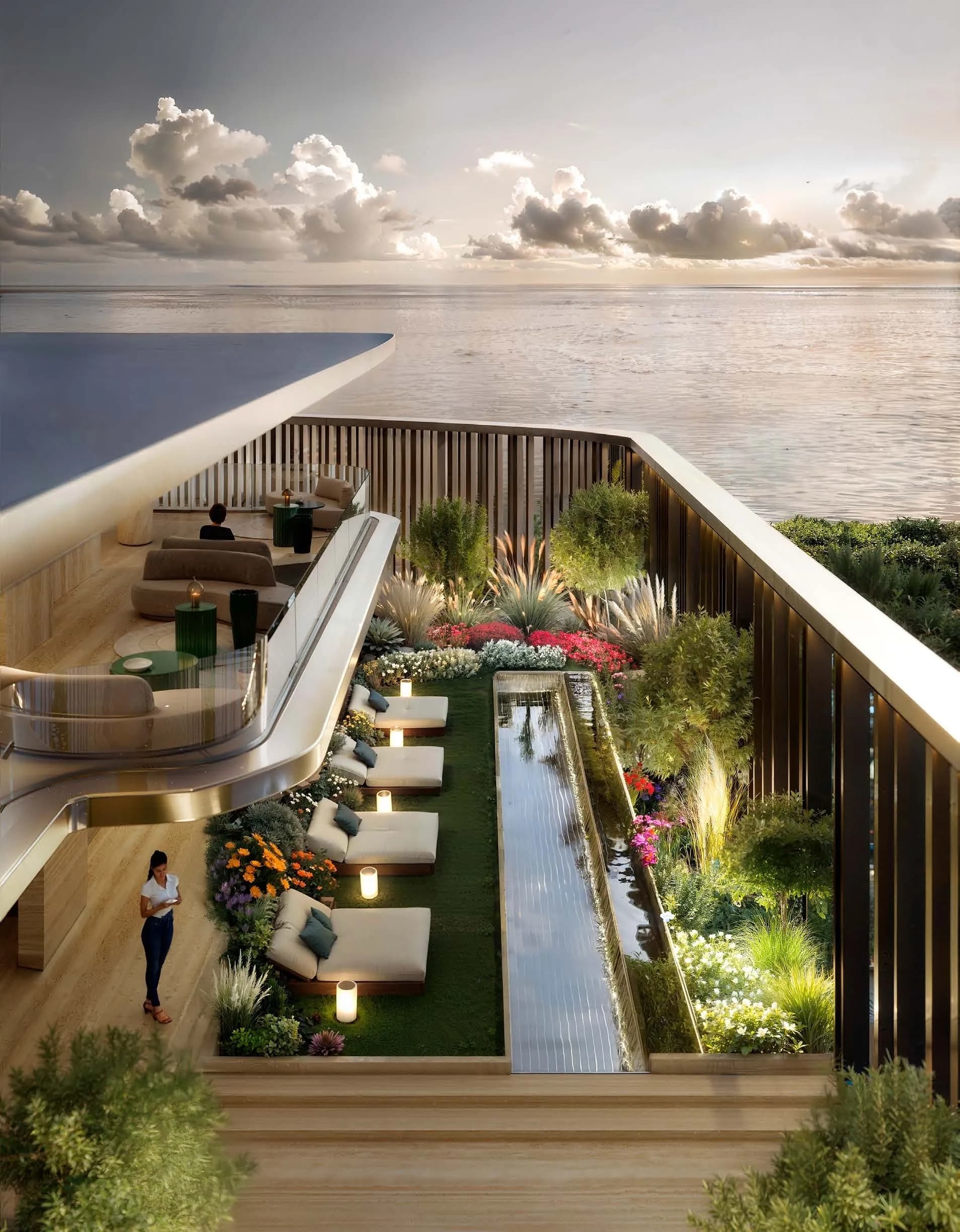 The infinity pool at the rooftop level is paired with a juice bar and sea views. Below it, sunken seating with a fireplace and a communal dining terrace create outdoor social zones suited to the cooler months. A secret garden terrace and a library round out the quieter end of the amenity range. For more active use, a sports lounge sits alongside an adult social pool with jacuzzis.