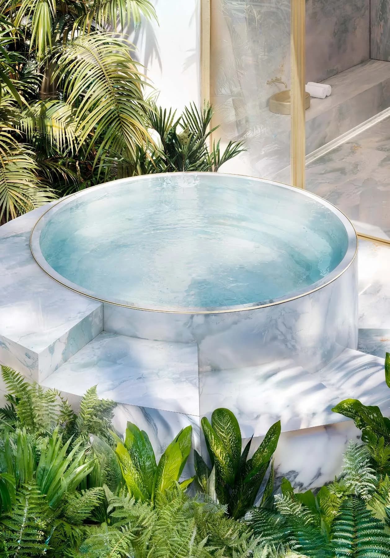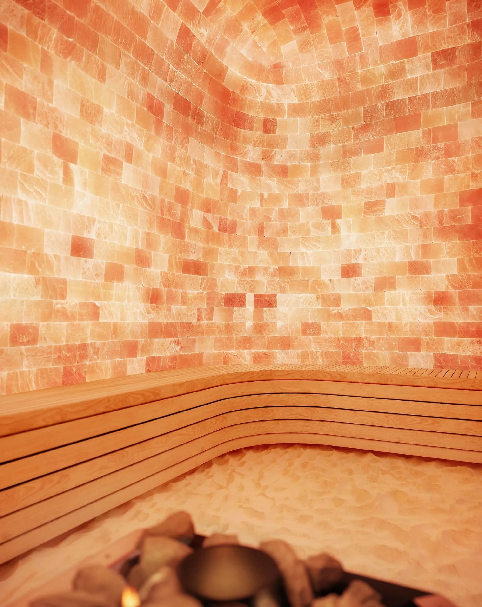 The wellness offer includes a sanctuary pool, salt sauna, steam room, cold plunge and both indoor and outdoor fitness space. The contrast therapy pairing of salt sauna and cold plunge reflects a programming sensibility borrowed from European spa design rather than the standard Gulf resort model.