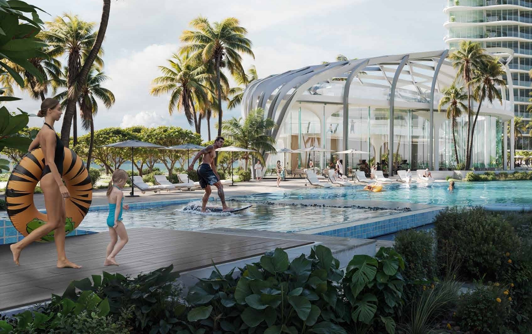 The podium amenity programme is extensive relative to the project's scale. The infinity pool with beach access forms the centrepiece, accompanied by a kids' pool and a surf-and-slide feature. Fitness provision includes an indoor and outdoor gym, a pilates studio, a yoga zone, an aerobics area, and a jogging track with a dedicated bike lane.