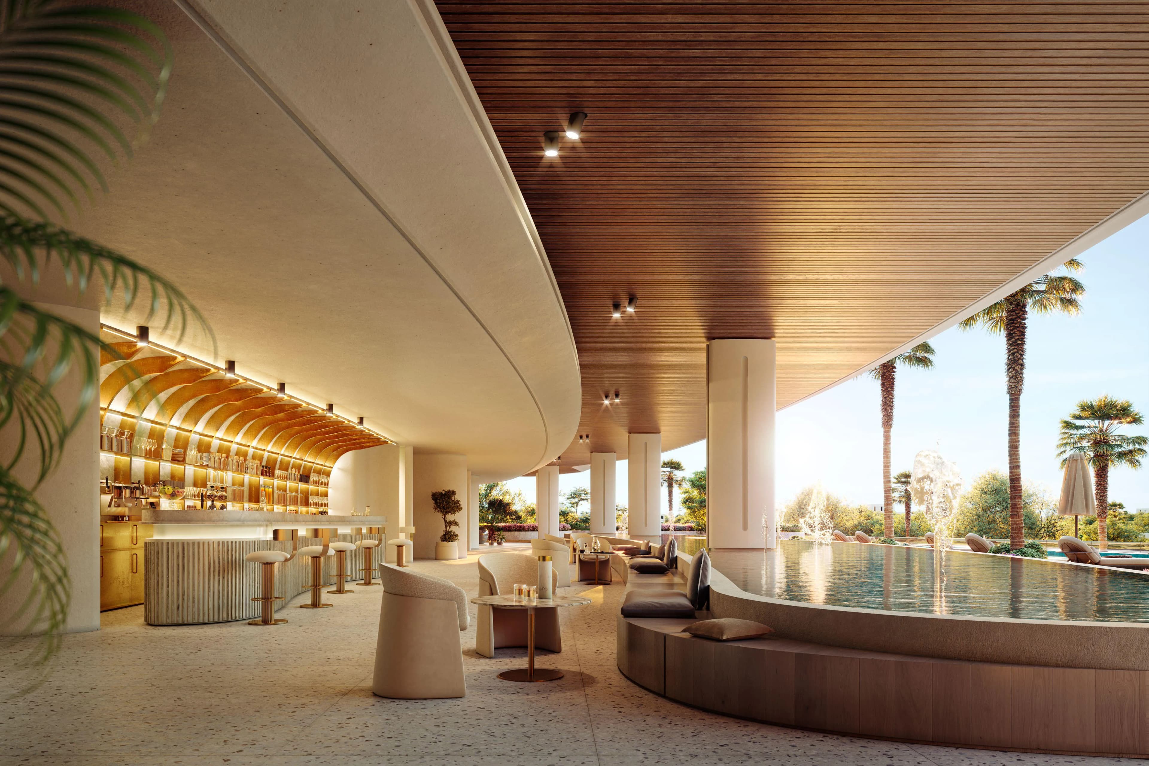 The building's design takes the coastal setting as its primary reference point. The form is conceived around fluid, curving lines rather than the straight-edged towers more common in central Dubai, a choice that suits the low-density, resort-inflected character Avenew is aiming for. With only 28 units across a single structure, the scale is deliberately intimate by Dubai standards.