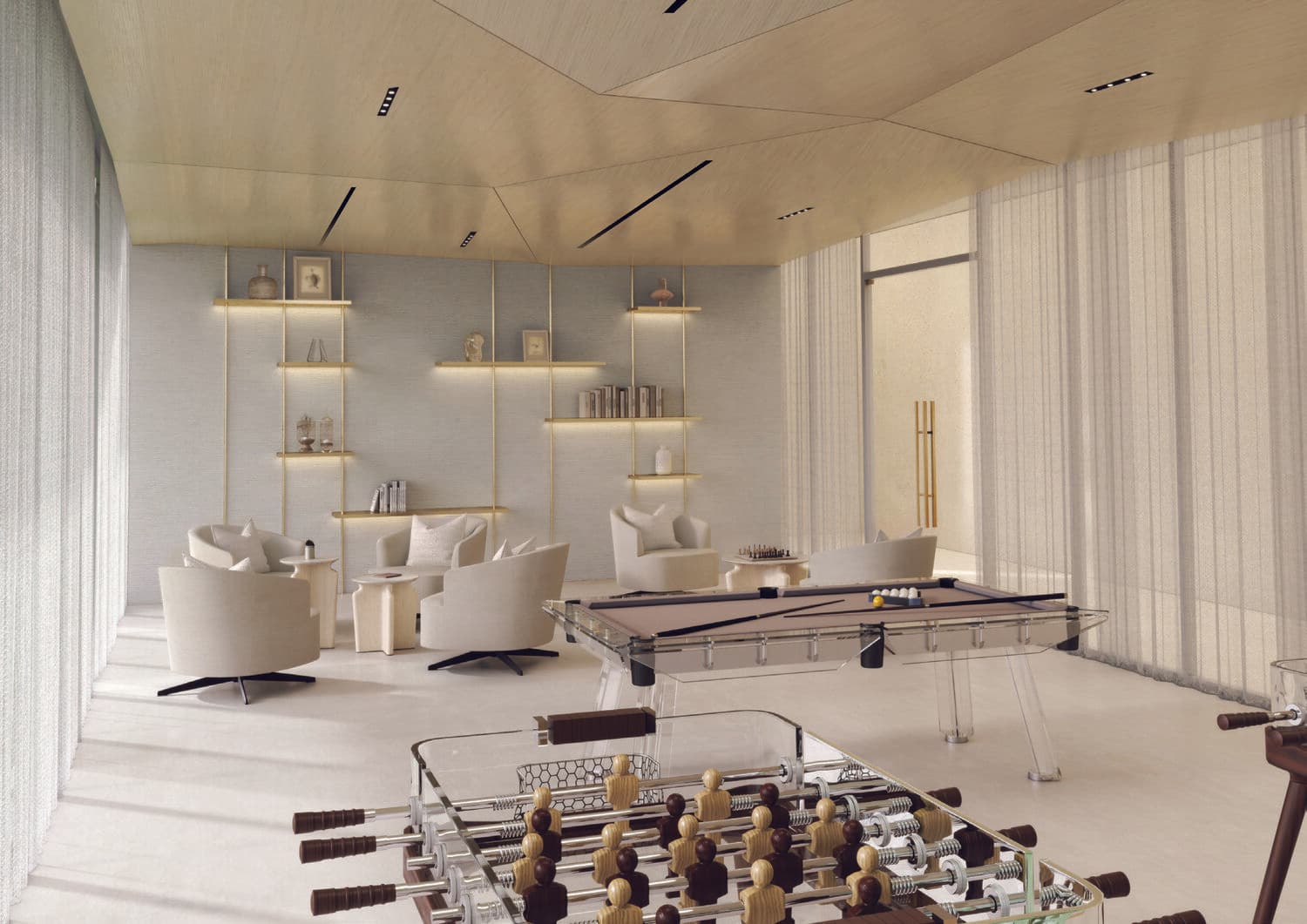 The amenity programme is broad relative to the building's scale. A Prestige Spa, a dedicated wellness area, an infinity pool, a sun deck and a jacuzzi address the health and recovery side. The outdoor offering extends to a BBQ terrace, an outdoor cinema, a water garden with a splash adventure zone, a miniature golf course and a library lounge.