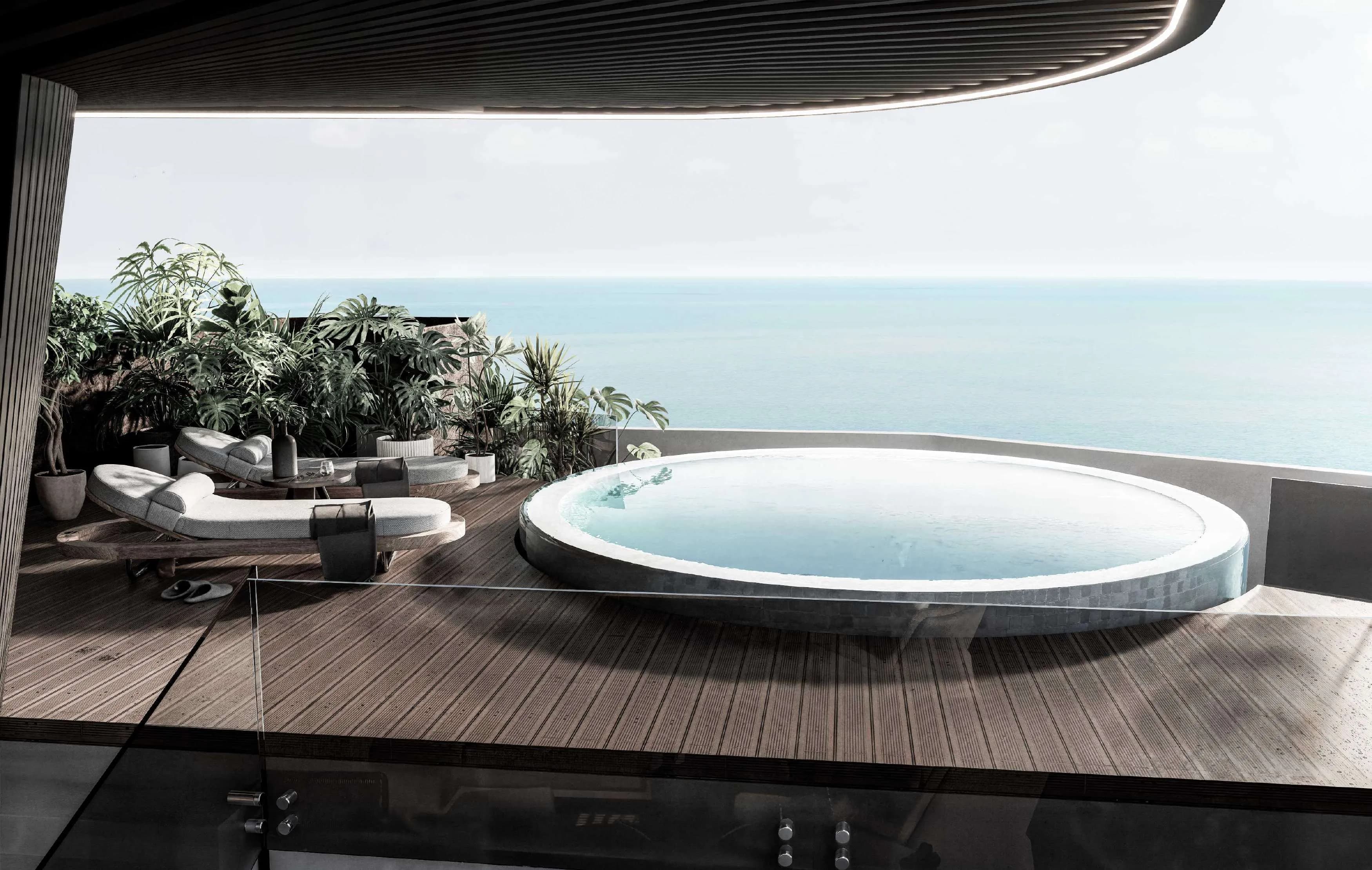 The building's shared facilities include an infinity pool, a spa and wellness studio, a gym studio, and a lounge. Private balconies and jacuzzis are incorporated at the residence level rather than pooled as shared infrastructure, which meaningfully increases the usable private outdoor space per unit.