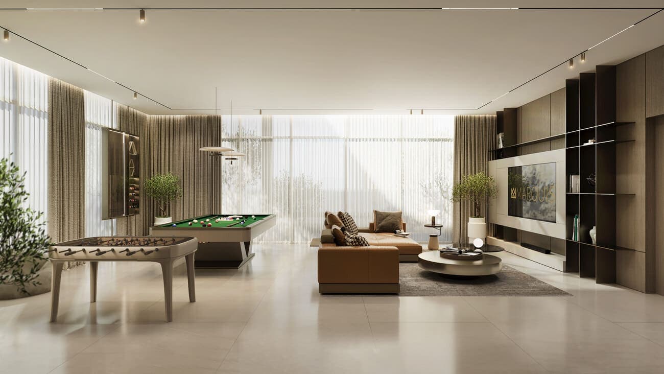 The shared facilities cover a reasonable range for a building of this scale. A pool deck and plunge pool address the core expectation for Dubai residential. The open cinema and game area skew toward a younger demographic or family buyers. A sauna, yoga area, and gym form a functional wellness offer without requiring residents to leave the building.