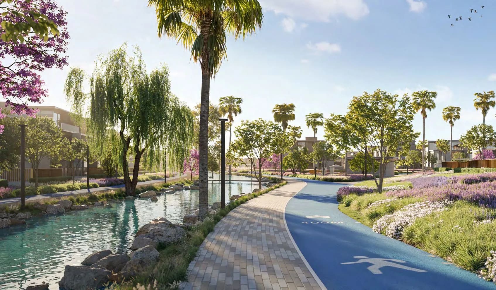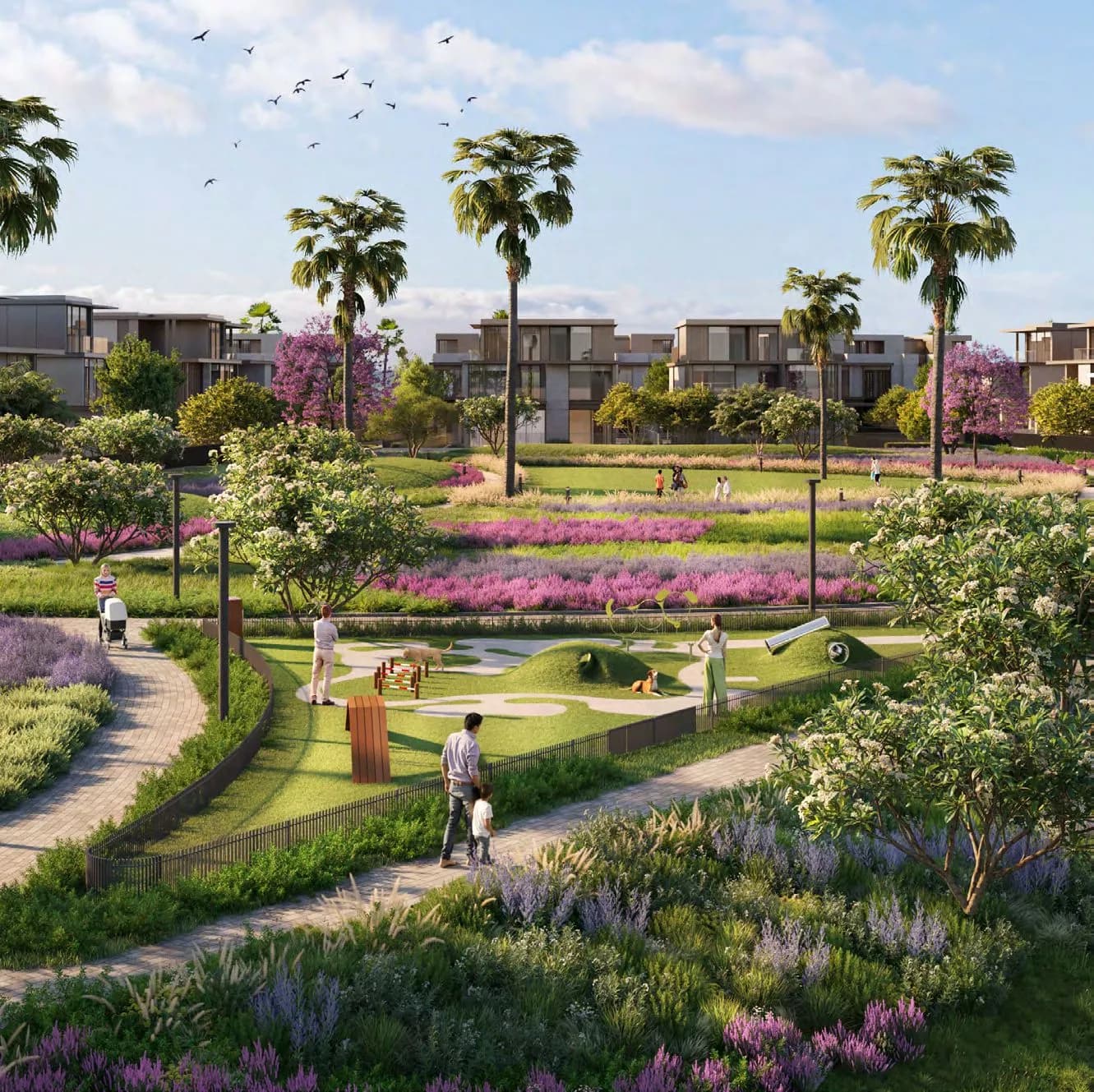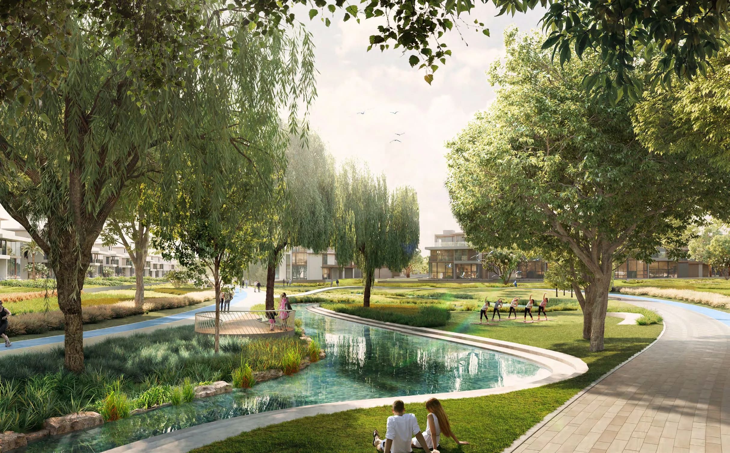 A lagoon and wave pool anchor the leisure infrastructure at the larger scale. Running tracks and a yoga lawn address daily fitness in a lower-intensity register. A sports area accommodates more structured activity. For families, there is a dedicated children's play zone and a dog park, both of which reflect the resident profile Meraas is designing toward. The events lawn and amphitheatre give the community a venue for organised social programming without requiring residents to leave the gates.