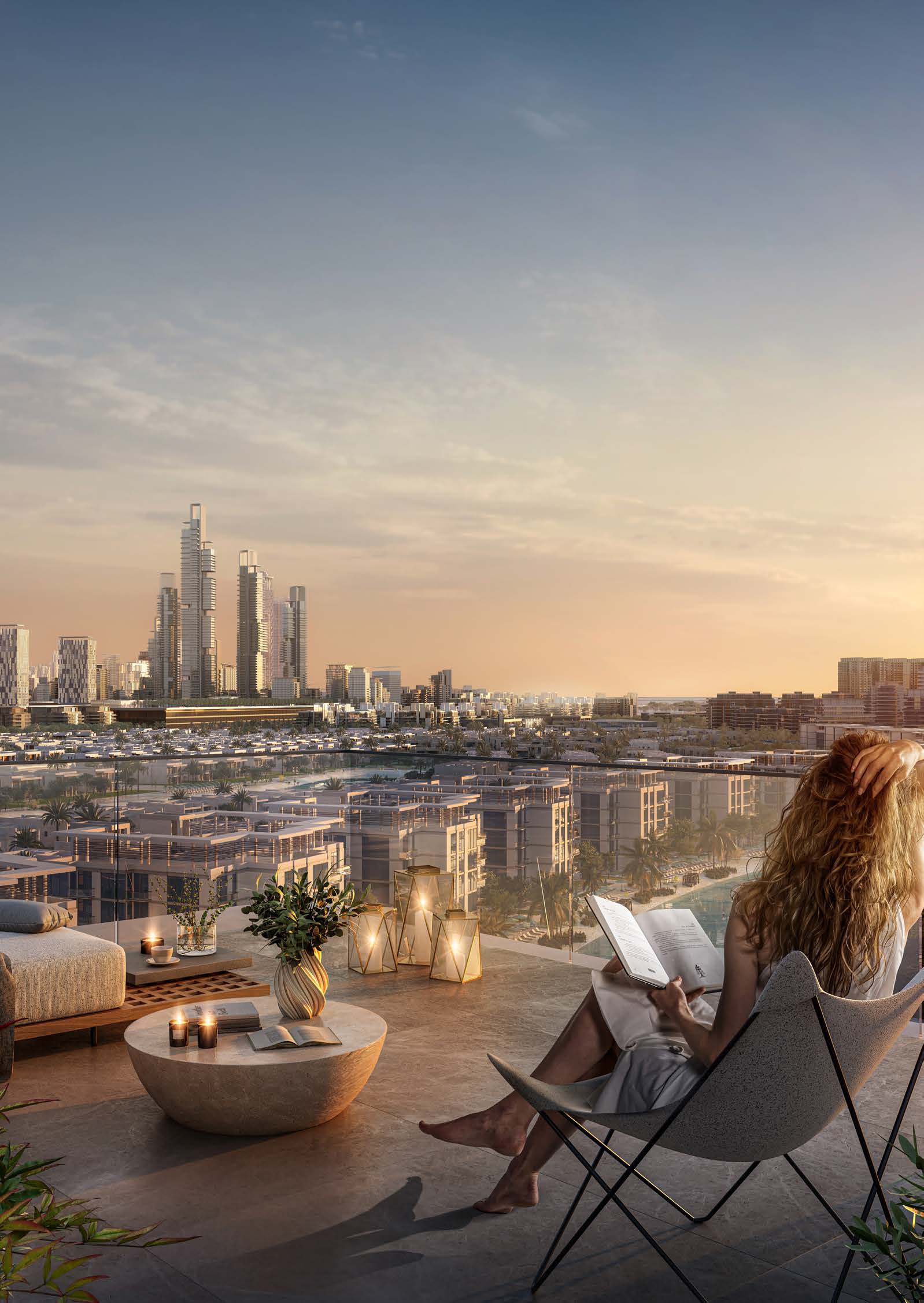 The building range runs from one-bedroom apartments through to four-bedroom homes, lagoon-facing villas, and five-bedroom penthouses. Floor-to-ceiling glazing is standard across the range, oriented to capture either Crystal Lagoon views, Dubai skyline sightlines, or both.