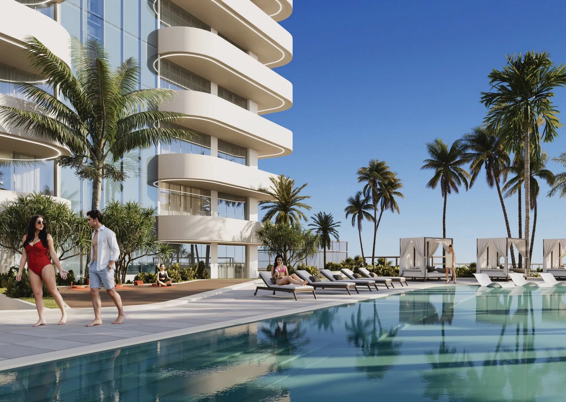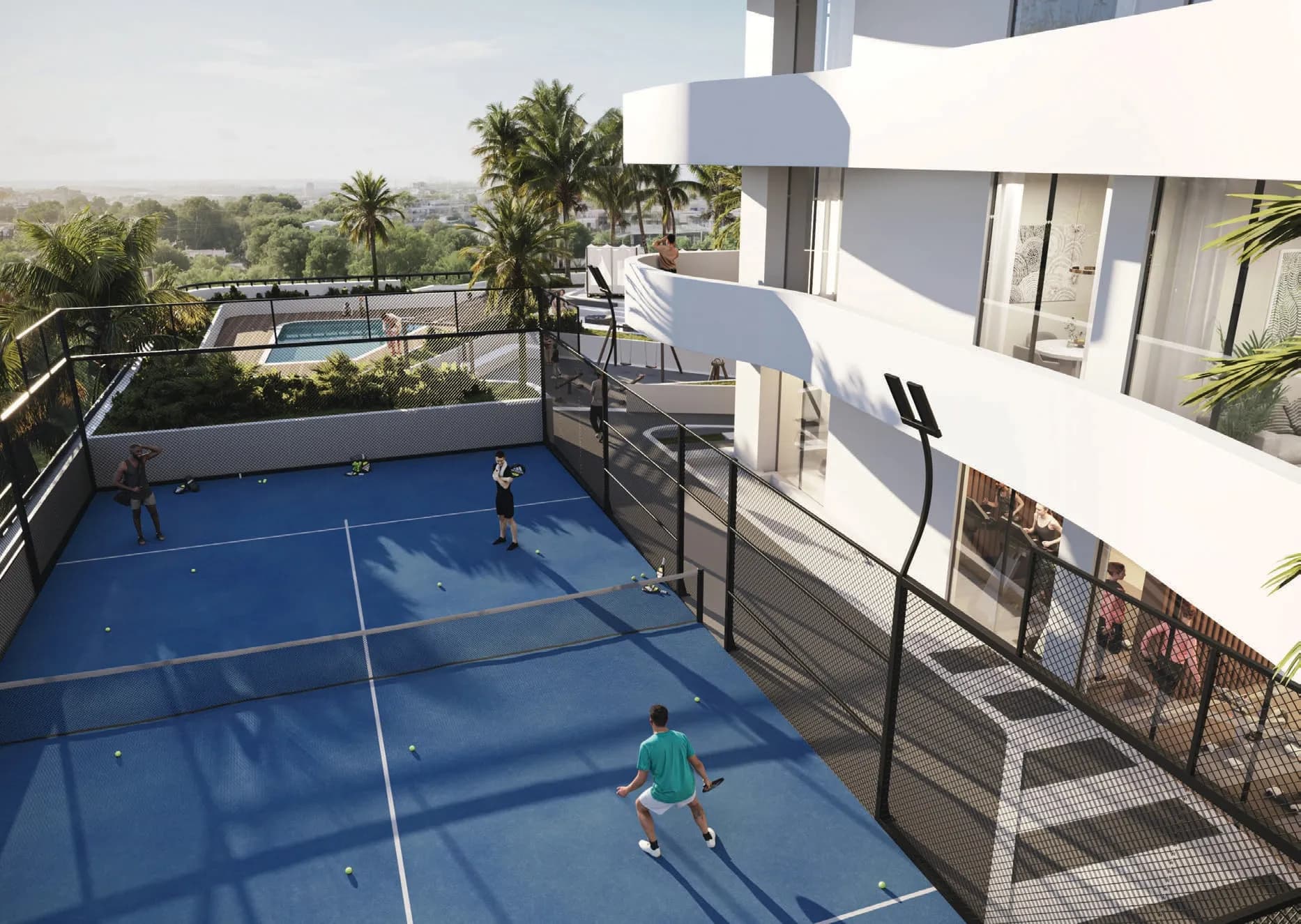The building's communal offering is broad relative to its 32-unit footprint. Residents have access to a swimming pool with a dedicated pool deck and cabanas, a zen garden, a yoga deck, and a gym. More active provision includes a padel court, and family-oriented spaces include a children's play area and a BBQ area.