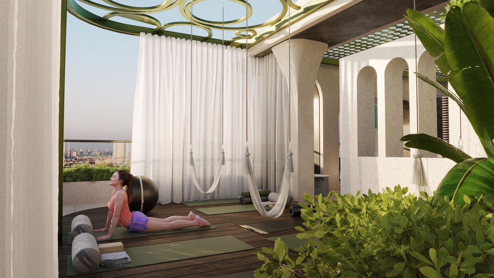 The rooftop carries an infinity pool alongside a jacuzzi, a yoga and pilates area, and a gym with panoramic city views. An outdoor cinema operates at the building level, positioned within what Segrex calls the Olive Garden and Chillout Yard.
