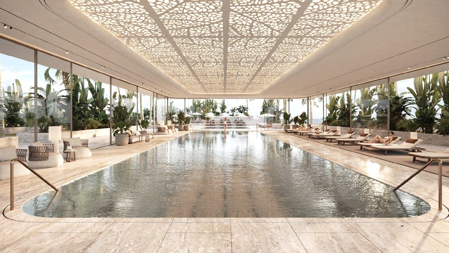 The facilities list is short and intentional. A sunset lounge and a residents-only cigar lounge define the social offering. For sport and recovery, there is a temperature-controlled indoor lap pool, a cycling studio and access to private pools. The beach access is private, anchored by Orla's exclusive beach club.