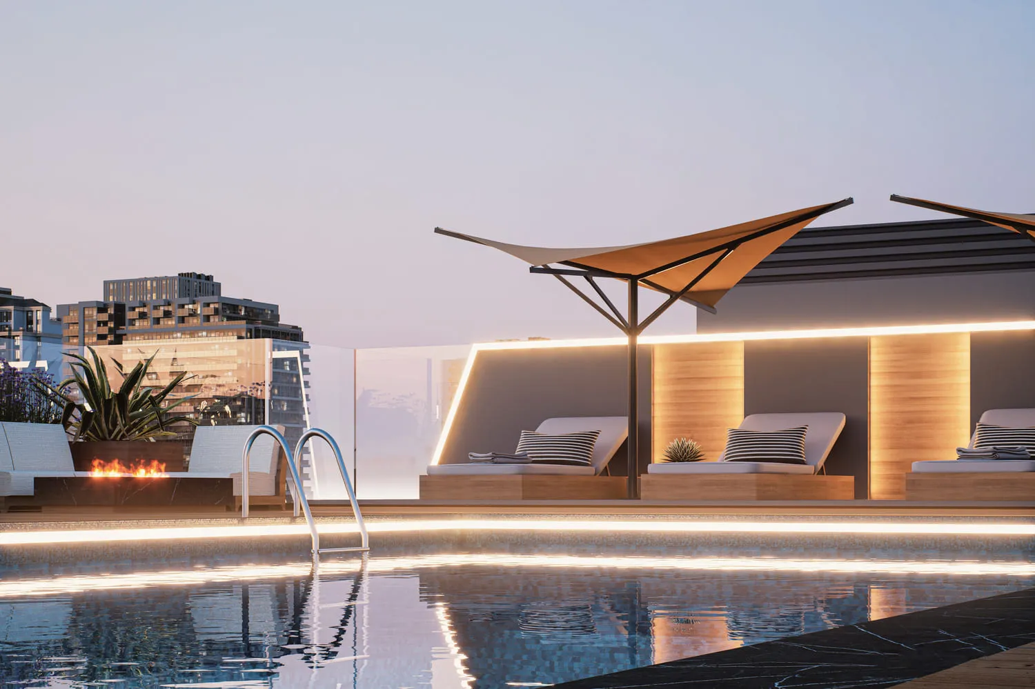 A fully equipped gymnasium anchors the fitness offer. Separate adult and children's pools are accompanied by a poolside lounge deck, giving the water facilities a dual function across different resident profiles.