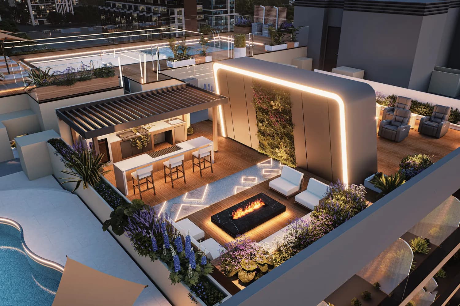 The social amenities take an outdoor-first approach: an outdoor cinema, an outdoor firepit lounge and a BBQ area address the expectation of communal evening use that has become standard across Dubai's mid-market residential launches. For a 66-unit building, the breadth of this provision is reasonable rather than excessive, which tends to make day-to-day access more dependable.
