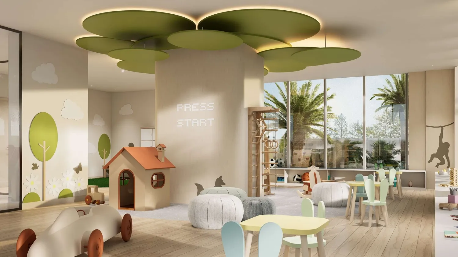 The amenity offering is functional rather than resort-style. Residents have access to a swimming pool, a gym, a dedicated fitness studio, and an indoor children's play area. A co-working space and a multipurpose room round out the communal facilities.