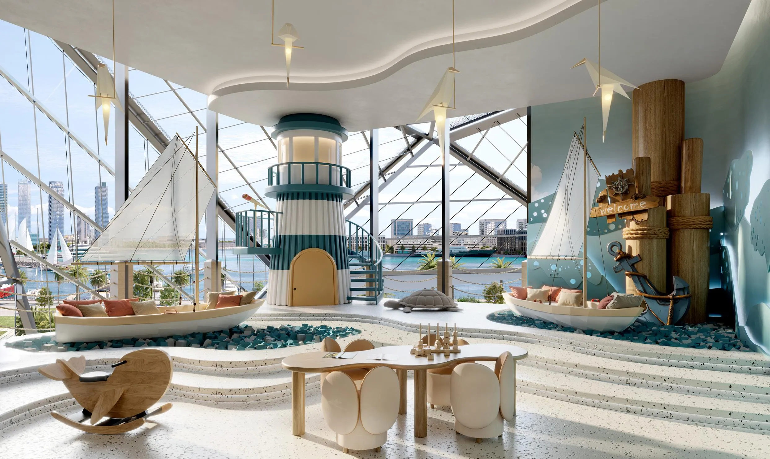 The shared facilities across the podium cover a broad range of functions without doubling up unnecessarily. The wellness offer includes a fitness studio, spa, and a dedicated yoga area. For daily activity, there is a running track and pool with cabanas. Social and working spaces include a co-working area, clubhouse, arcade room, and outdoor seating. Families with children have access to a kids play area. The grounds also include garden areas and a pavilion with a retail drop-off point.
