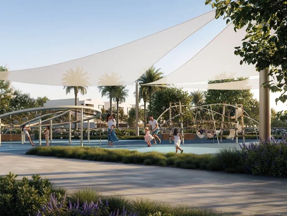 The architectural language follows principles of light and openness. Natural tones, horizontal massing, and generous glazing define the elevations, placing these homes closer in sensibility to low-density residential projects in Jumeirah or Al Barari than to the apartment towers that dominate most Dubai postcodes. At ground level, the Linear Park weaves through the community, providing a pedestrian spine that connects homes to shared amenities without resorting to a grid of roads.