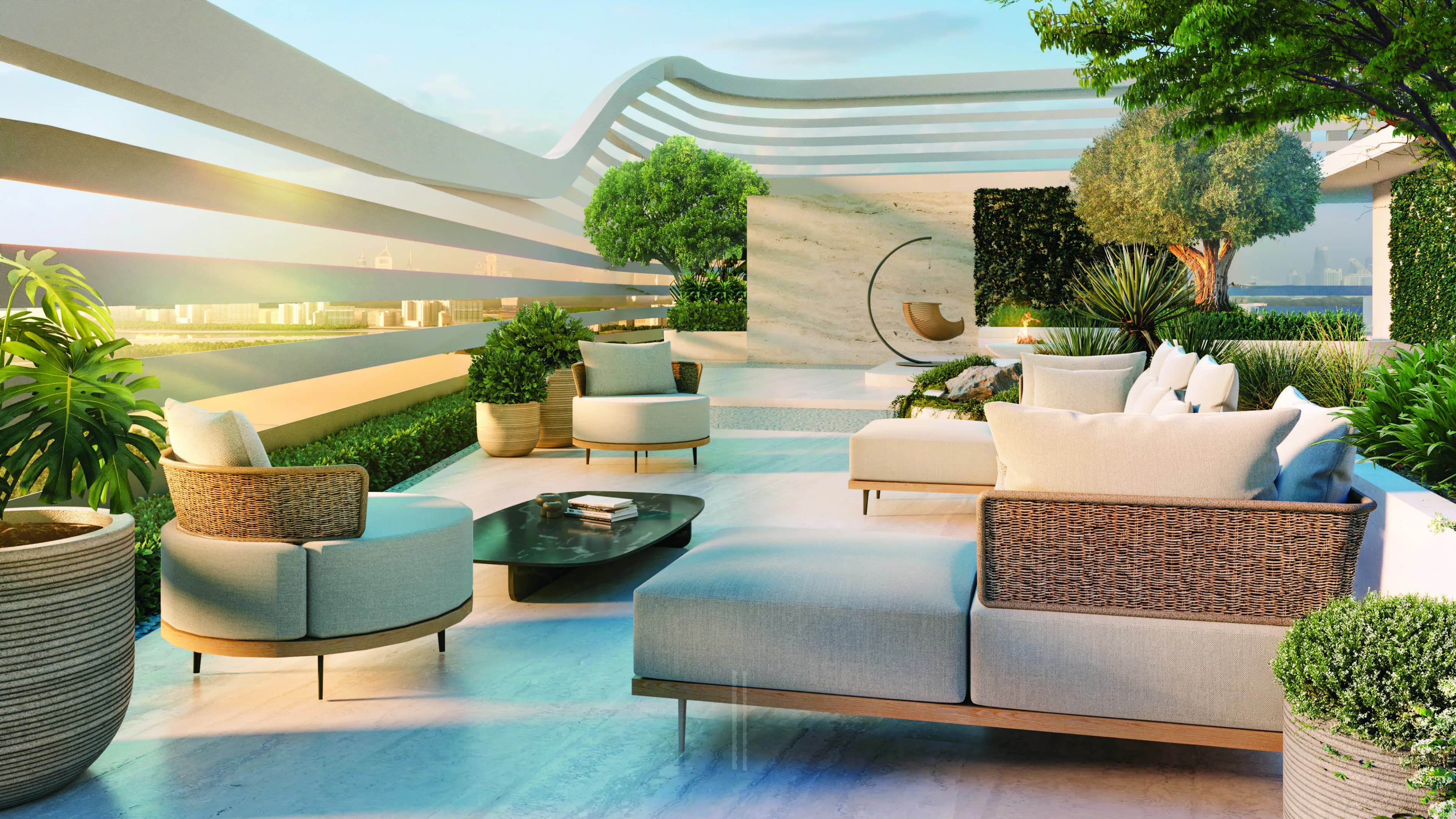 The development is a single tower. At 29 units, the count is deliberately low, which limits the density of the building and the communal areas without constraining the specification. The façade works with glass and clean geometric lines, designed to draw in natural light across living spaces and frame the contrast between the wetland reserve and the Dubai skyline beyond.