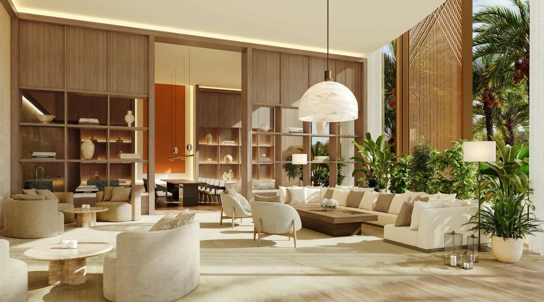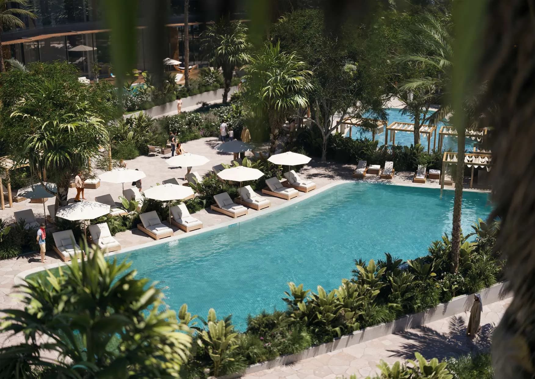 The amenity offer draws directly from the EDITION hotel operation rather than a standalone residential management company. Residents have access to a private beach, multiple pools and terraces, specialty restaurants and bars, social lounges, an indoor gym, and a spa and wellness centre. Landscaped gardens, a sunbathing lawn, and outdoor event areas complete the outdoor programming.