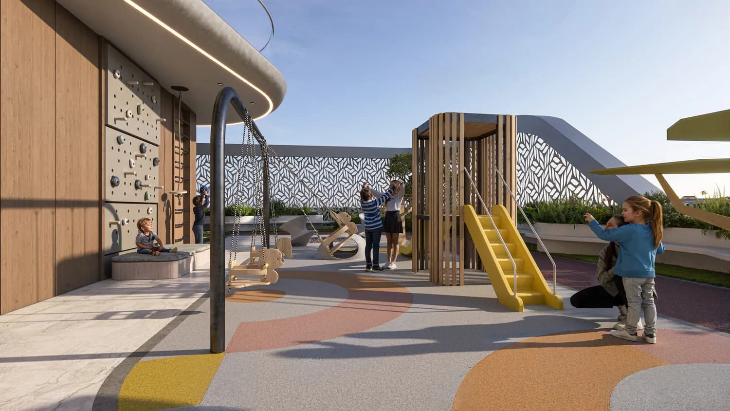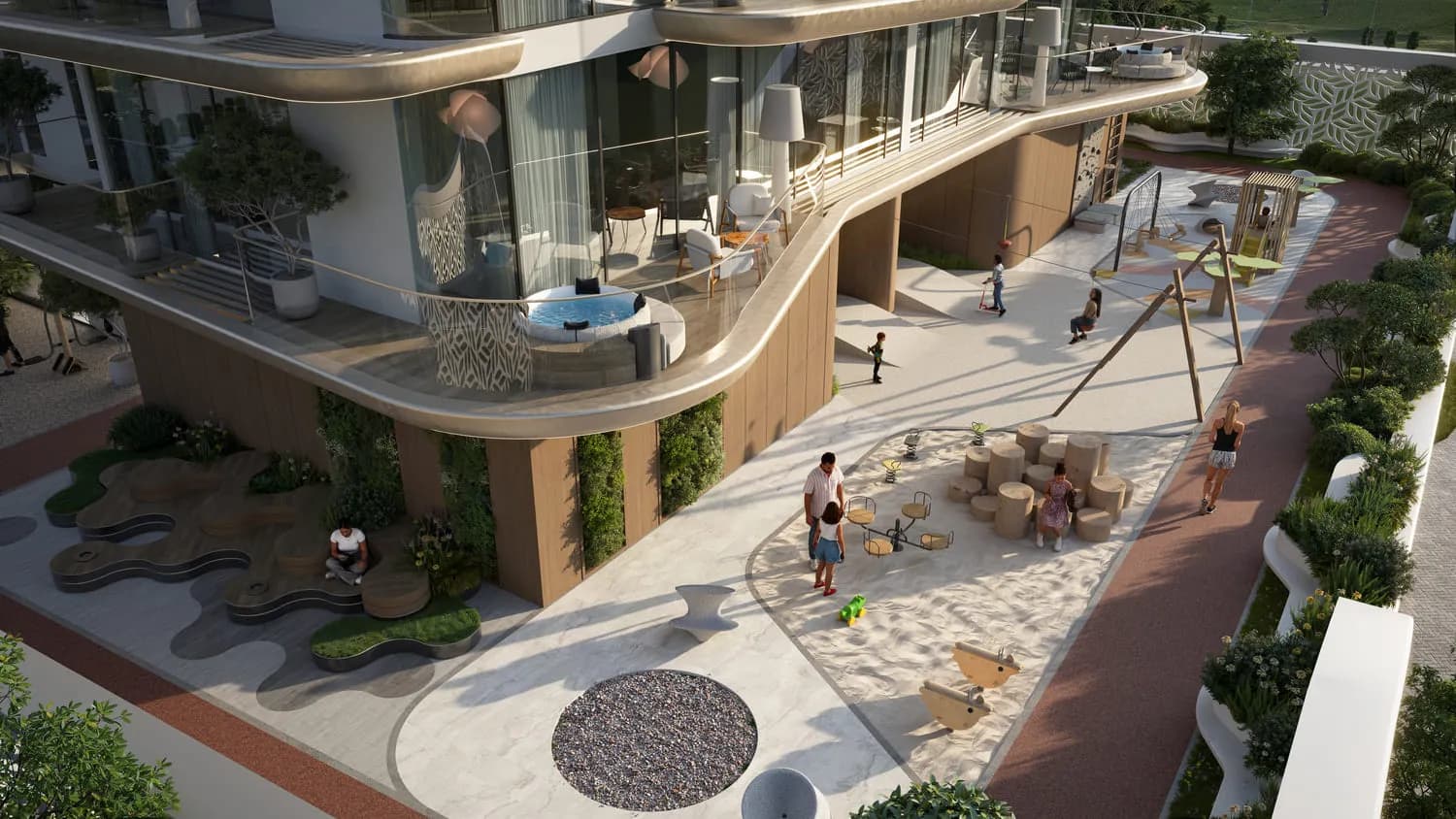The amenity list at Treppan Living Privé is extensive relative to a 20-unit building. Facilities include a swimming pool, an endless pool, an aqua gym, water loungers, sun beds and a kids' pool, alongside a conventional gym, an outdoor gym, and a sand pit playground for younger residents.