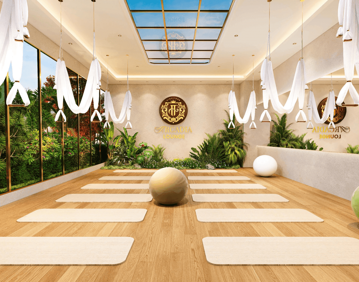 The amenity stack at Aqua Flora is notable for its density relative to a 50-unit building. Seven experiential gardens run through the development alongside dedicated aqua gardens and private terrace gardens attached to individual residences. A dive-in cinema occupies one of the communal zones. The rooftop holds a sky lounge. Ground-level and podium programming includes a spa and wellness facility, gym, kids' adventure park, BBQ area, business lounge, café lounge, Arcadia lounge, Veranda Garden Café, and retail spaces.