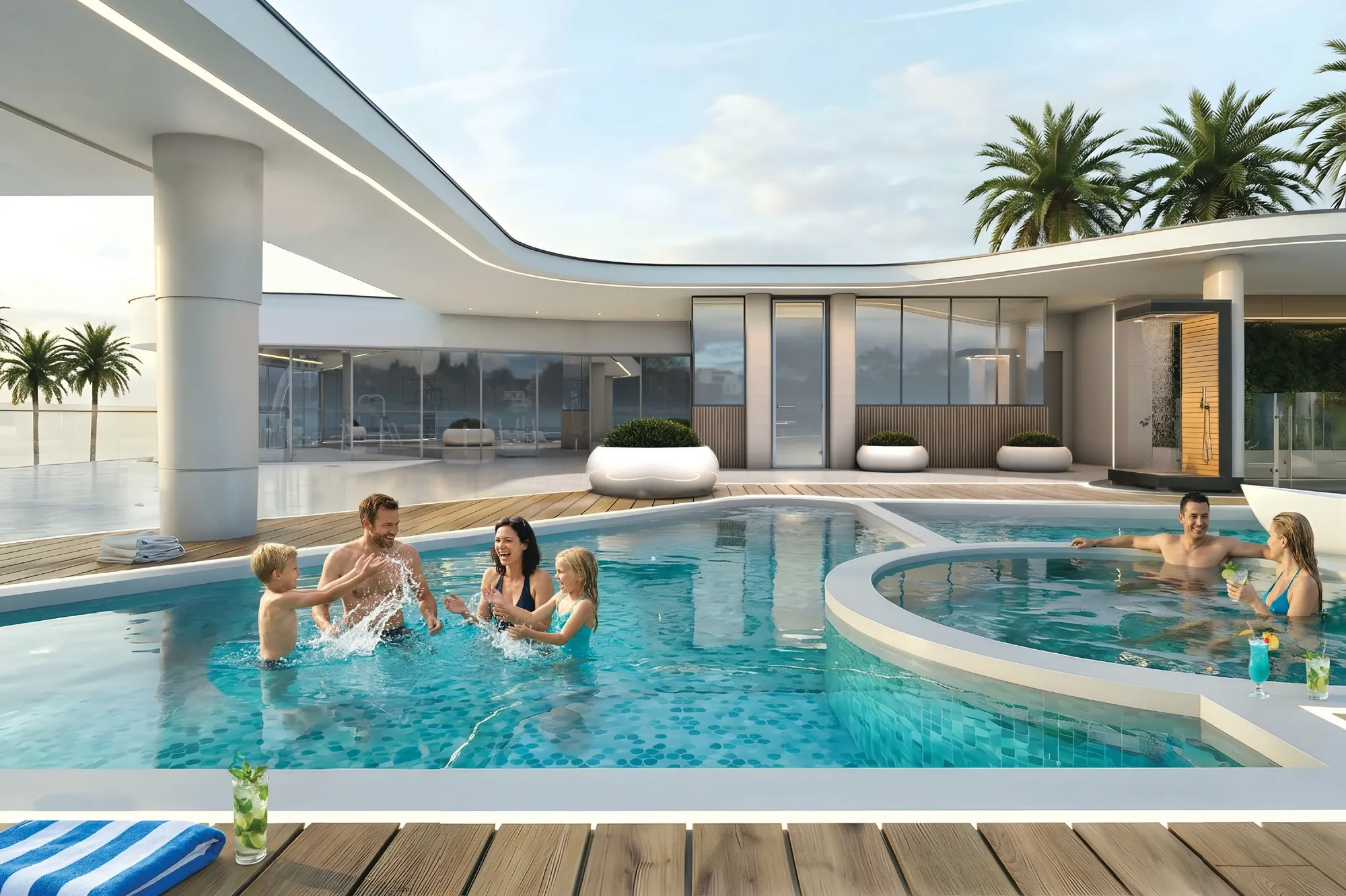 The amenity offering is broad for a 45-unit building. Residents have access to a swimming pool, sun decks, a Jacuzzi area and a separate children's pool. A rooftop café and bar serves as the social anchor at height, complemented by a BBQ area and outdoor cinema at lower levels. Fitness provision includes a gym, yoga area, and steam and sauna rooms. A games room and children's play area complete the picture.