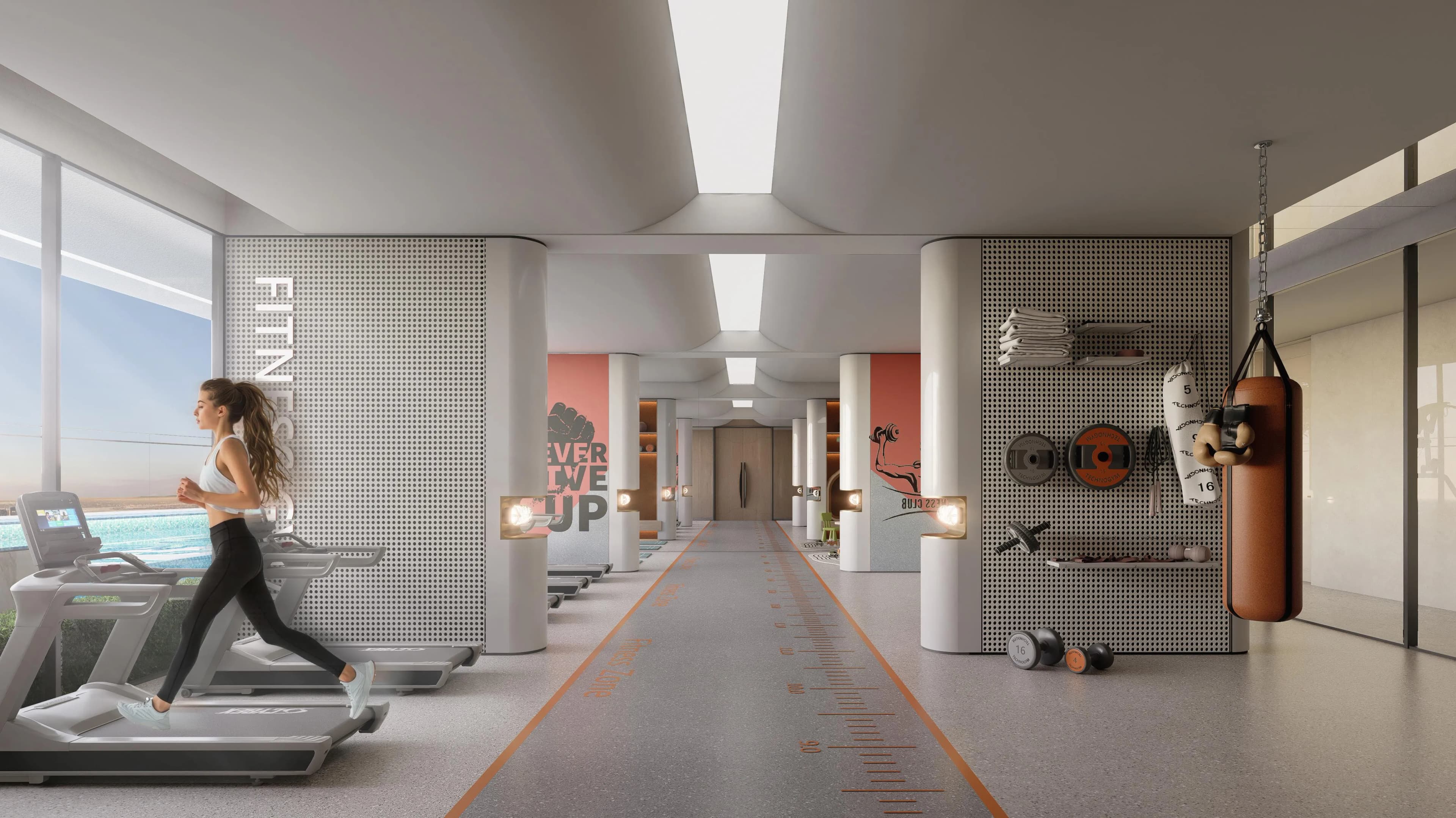 The building carries a focused amenity offering. A swimming pool and a gym anchor the health and fitness component, alongside a dedicated sports area. Residents with a more contemplative routine have access to a yoga room, a meditation room, and a reading zone.